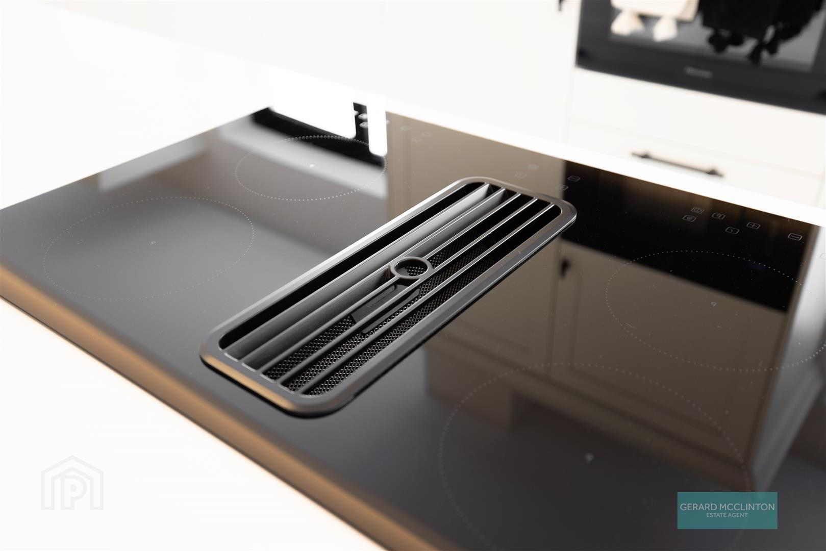 The kitchen is nothing short of spectacular, finished with premium Dekton by Cosentino worktops, handcrafted solid wooden cabinetry, a grand central island, a full complement of appliances, and a carbon black sink with dedicated filtered water tap. A laundry/utility room adds practical elegance, while three-zone gas heating ensures comfort throughout.