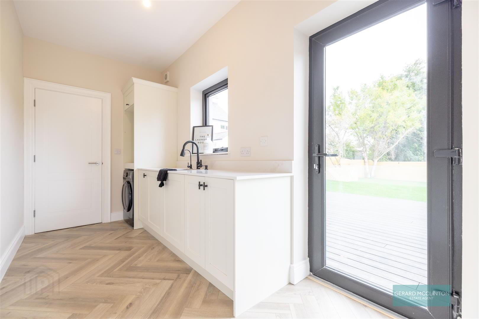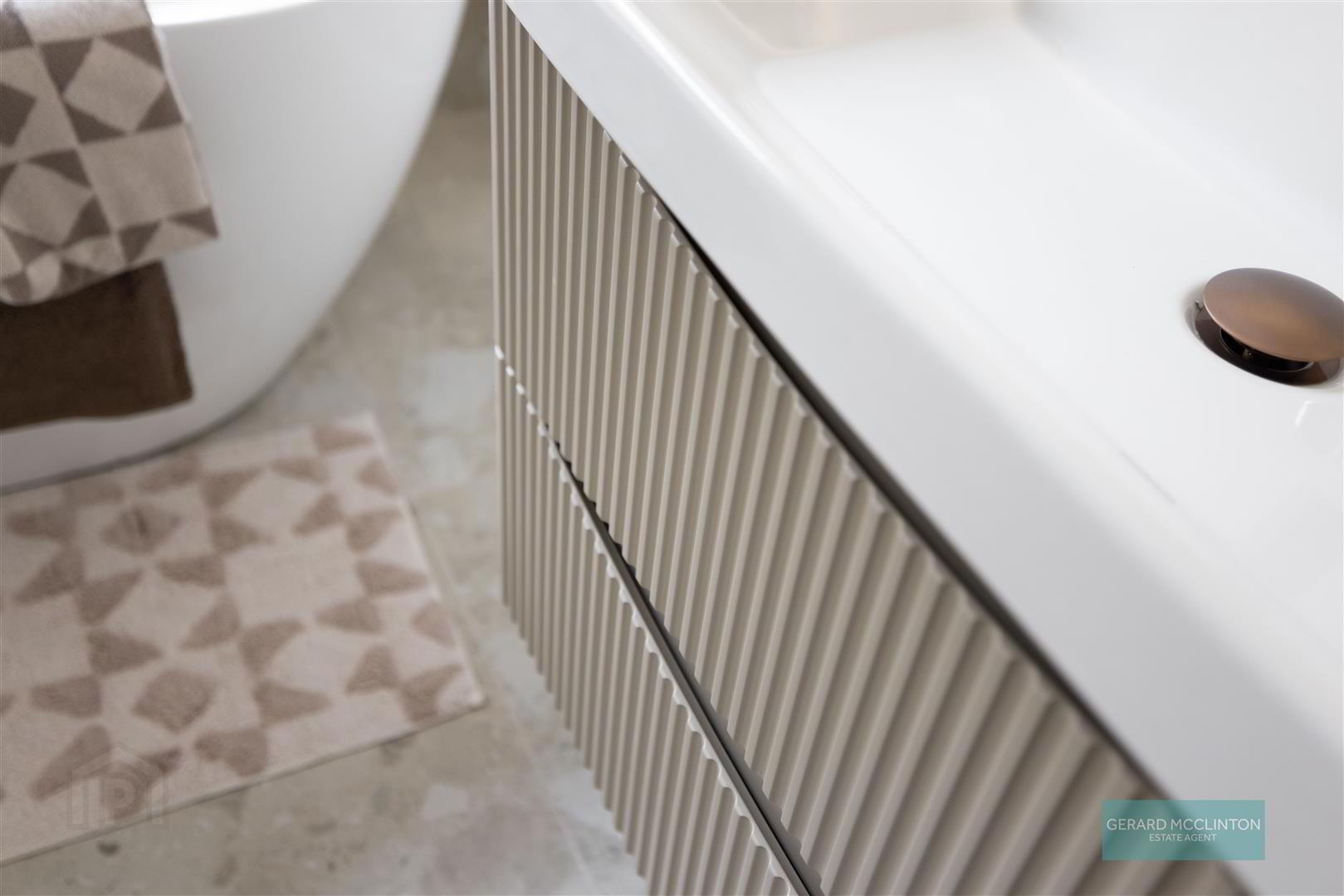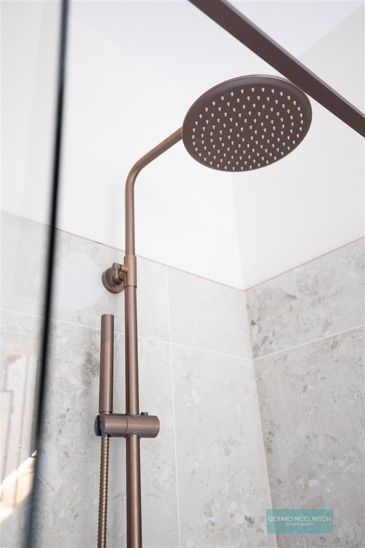 Upvc double glazed door and window to rear, engineered griege oak herringbone wooden floor. Similar to the kitchen, the quality units and worktops flow into this room, keeping the standard of finish exceptional. Solid wooden cabinetry with Dekton worktops, carbon black sink again with separate filtered water tap and soap dispenser. This room will also come with washing machine and separate tumble dryer.