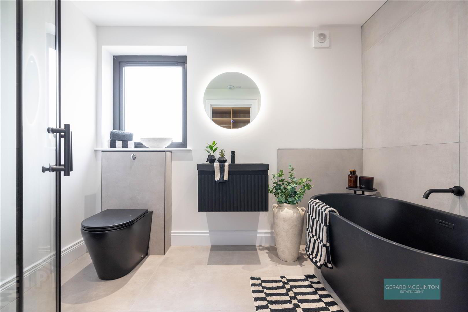 The primary en suite comprises a tiled floor, modern matt black shower cubicle with matt black fittings including over sized rain style shower and separate hand held shower, feature natural wood effect splashback. wc with concealed cistern, wash hand basin with fluted vanity unit and stunning freestanding soak tub with feature wall mounted taps, heated towel rail, wall mounted LED mirror, extractor fan, double glazed window to side