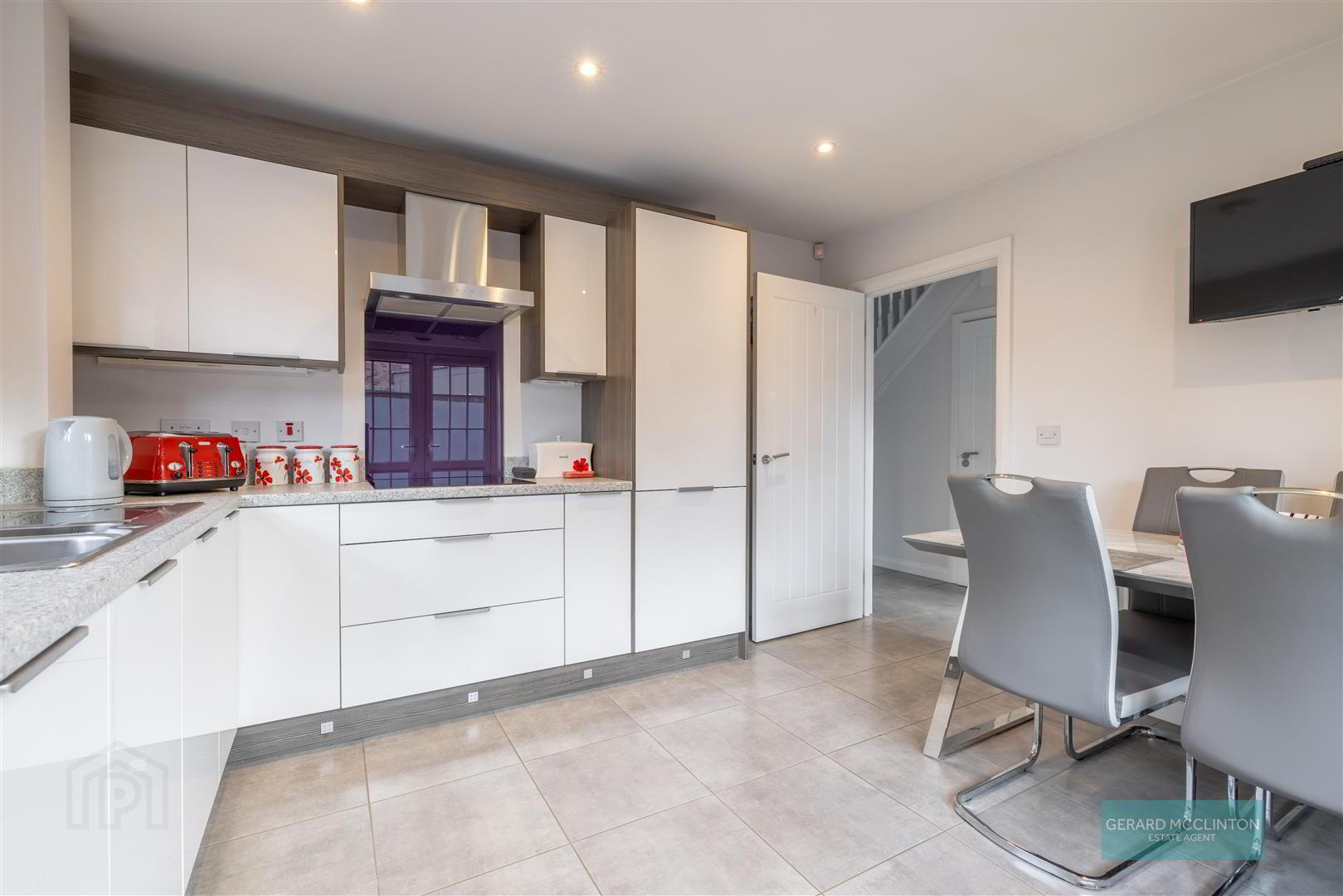 - Excellent range of high and low level high units with matching worktop surfaces, one and half bowl stainless steel sink unit, mixer tap., integrated fridge freezer and dishwasher. Built in oven and hob, stainless steel extractor fan and canopy, feature kickboard lighting, downlighters. Casual dining area with french doors to rear.