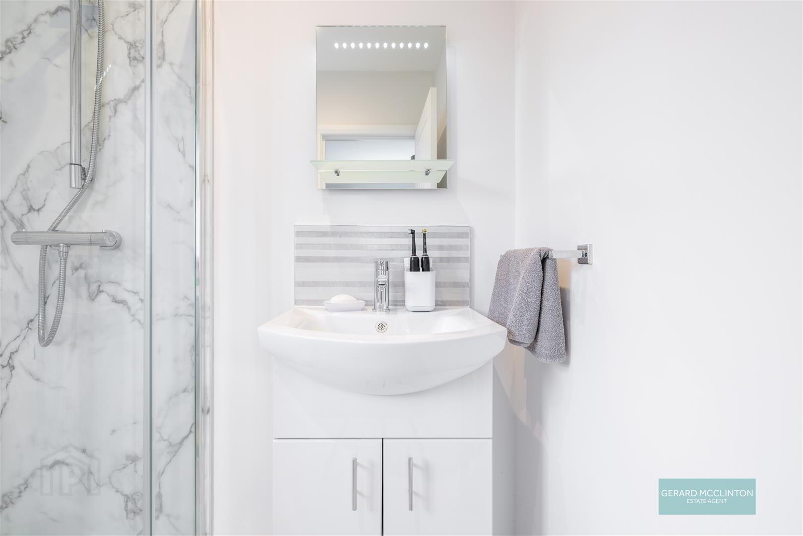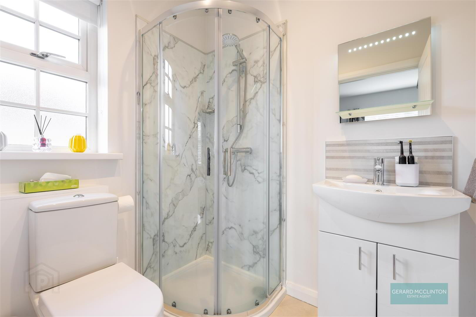 - Glazed shower cubicle with pvc panelling and thermostatically controlled shower, vanity unit sink, low flush wc, ceramic tiled floor, downlighters, extractor fan