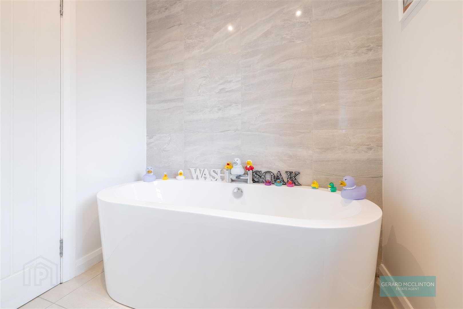- Modern white suite comprising freestanding bath, vanity unit sink, low flush wc, wall tiling and ceramic tiled floor, recessed downlighters, extractor fan and double glazed window