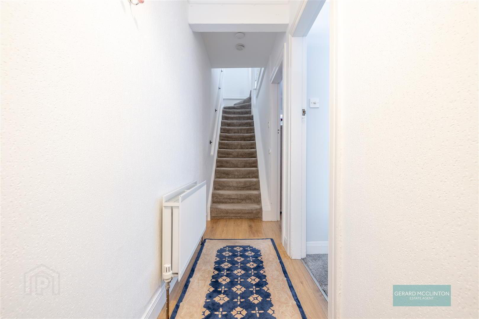 Black painted original door, laminate wooden floor, radiator, staircase to first floor