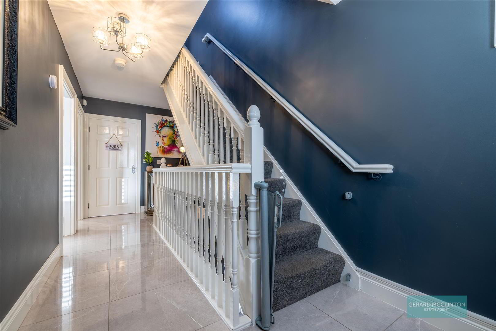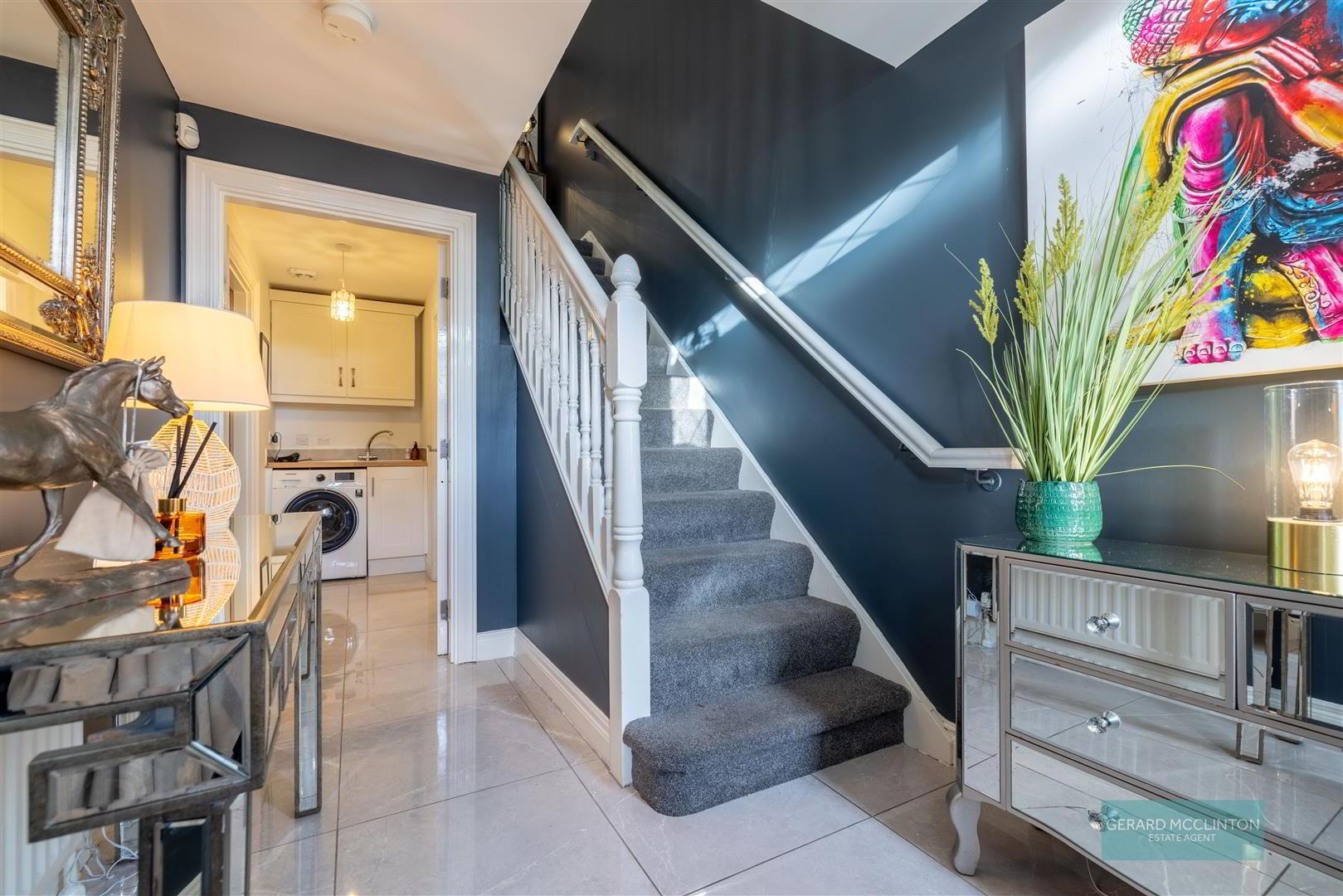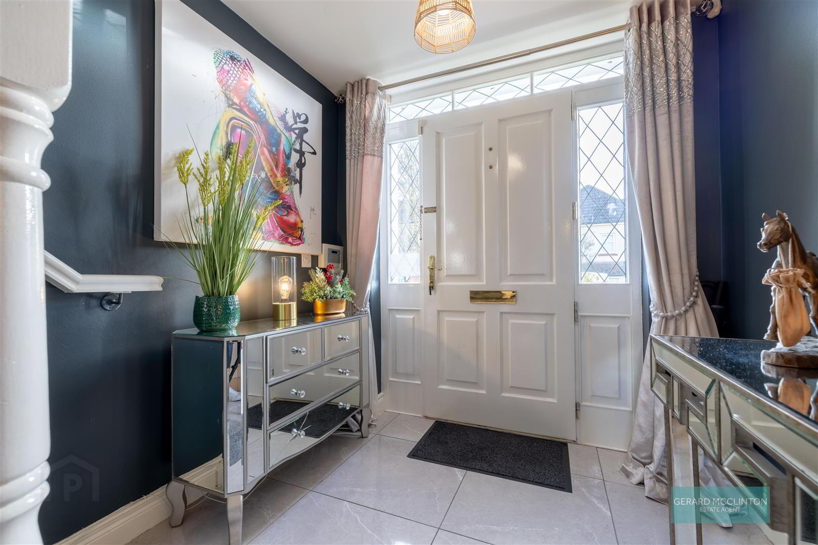 - Stunning entrance hall, door with glazed side panels, large porcelain tile flooring, radiator, stair case to first floor and door to utility, downstairs wc and cinema room
