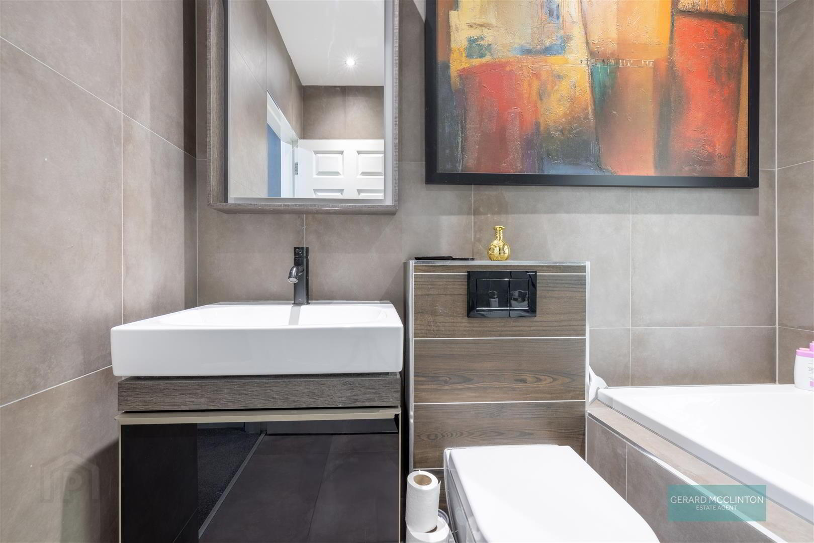 - Contemporary suite comprising tiled floor and walls, white wash hand basin with black fitting and vanity unit under, modern black radiator and white close coupled wc