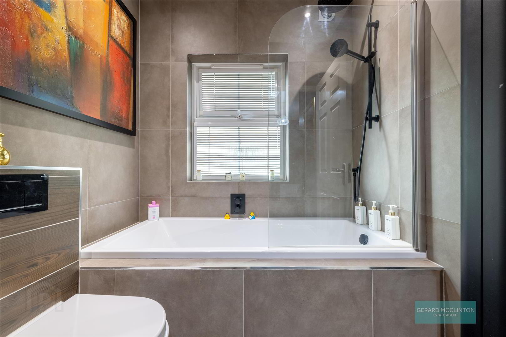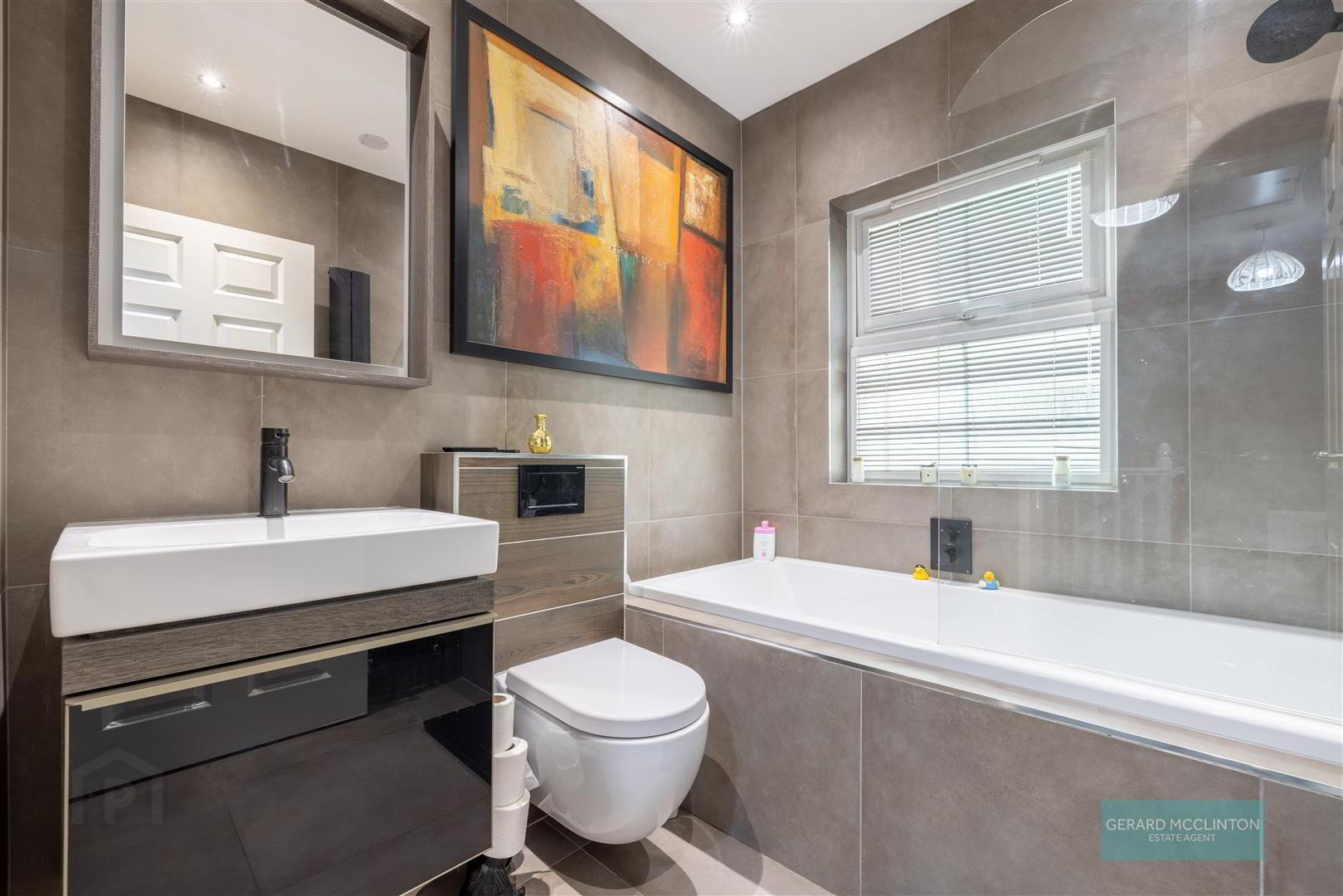 - Double glazed Upvc window to rear, tiled floor, tiled walls, bath with central controls, shower screen and black shower over, enclosed cistern wc, wash hand basin with central mixer tap and vanity unit under, steam resistance wall mounted television