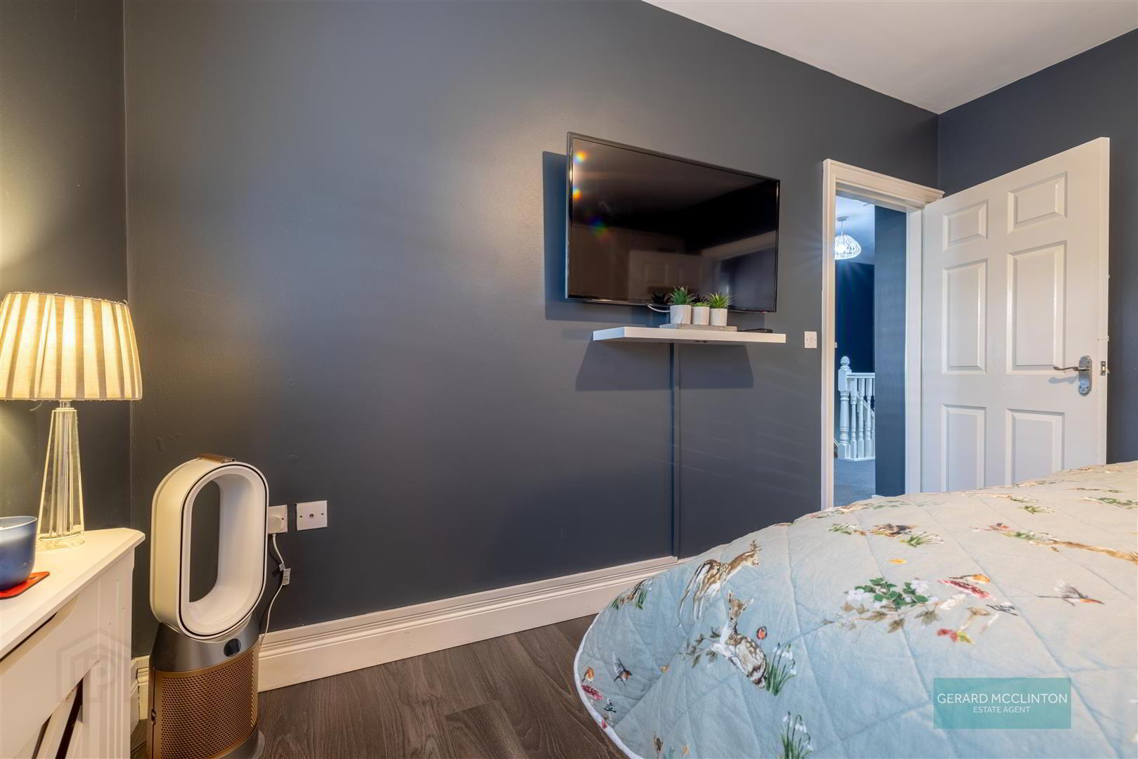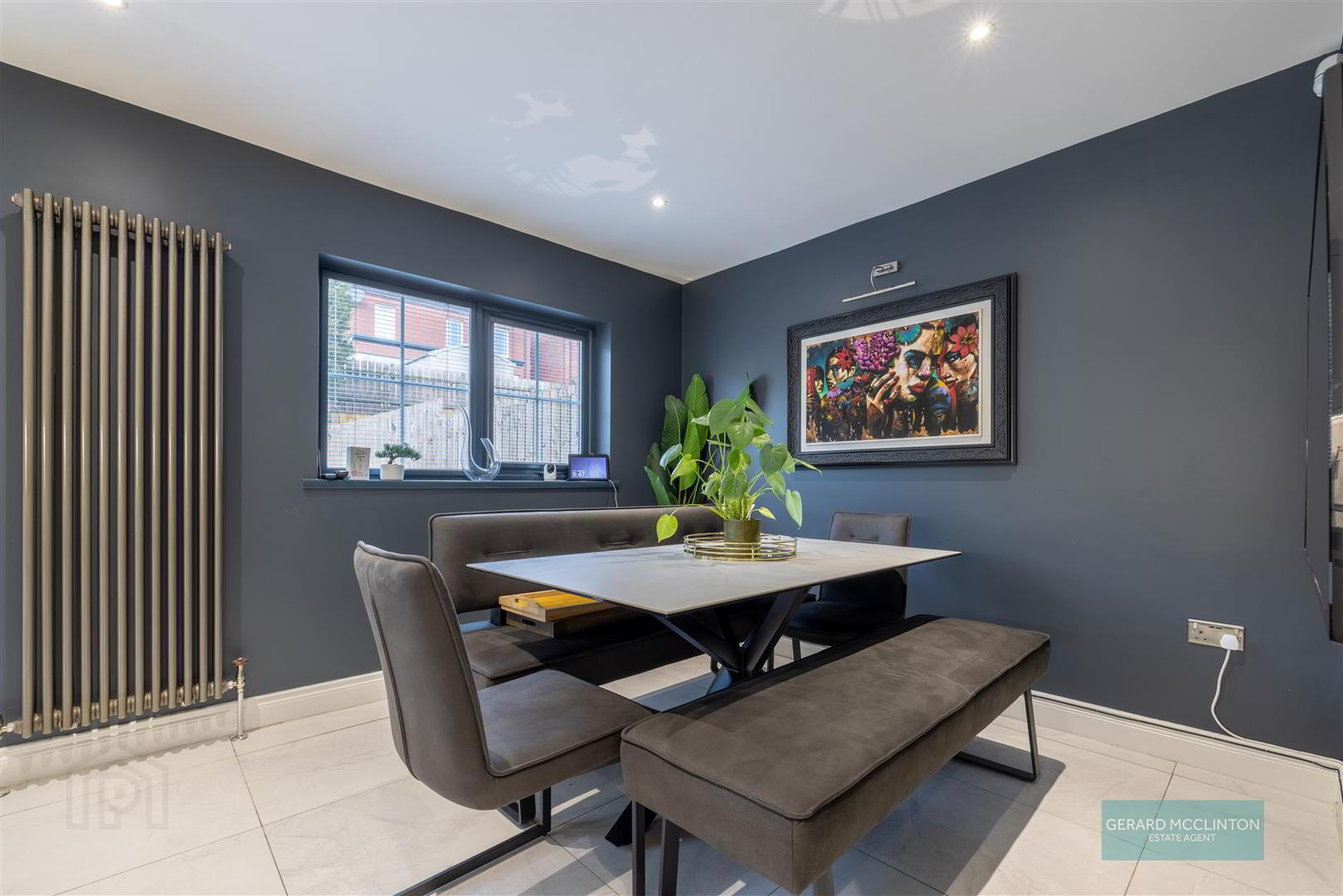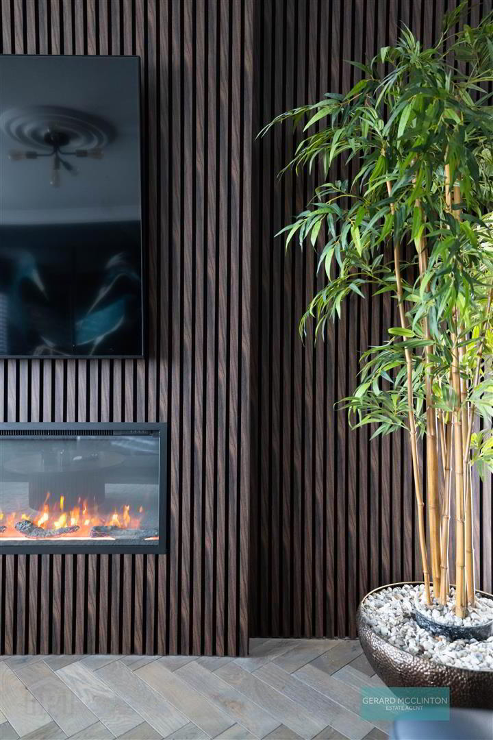 - 2 x Double glazed upvc windows to front with superb views over Belfast, herringbone wood flooring, ceiling coving, fluted feature wall with contemporary flame effect fire