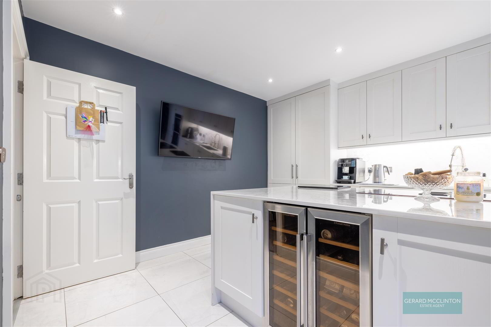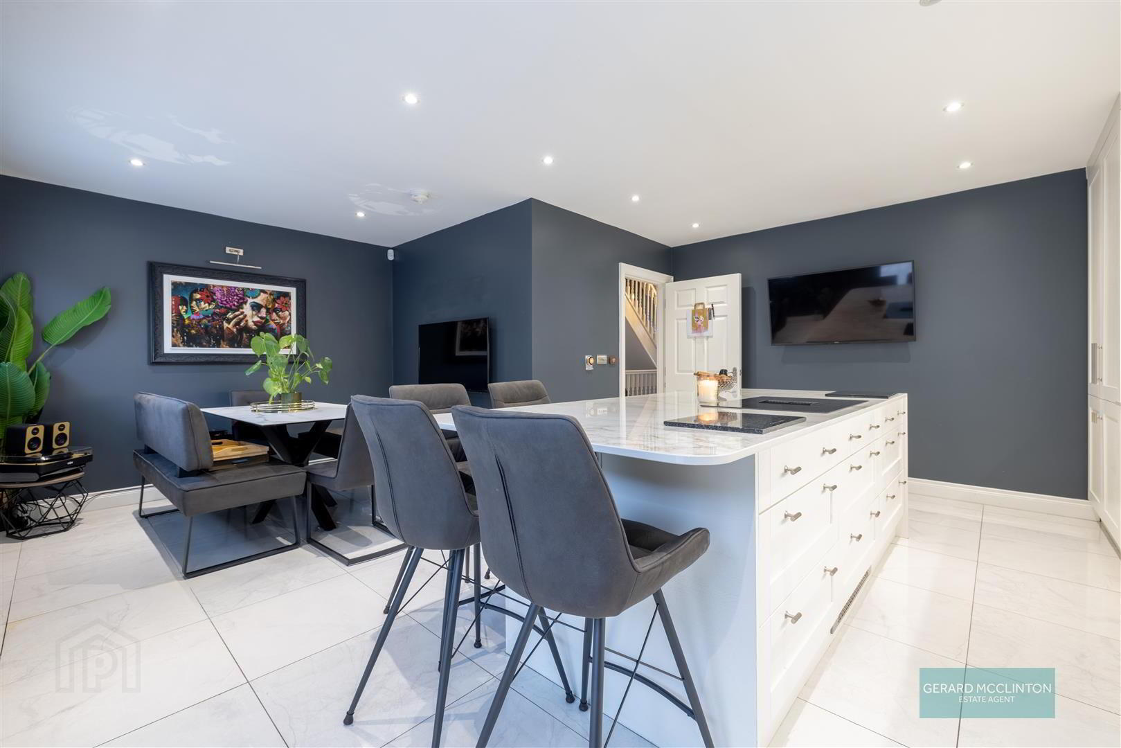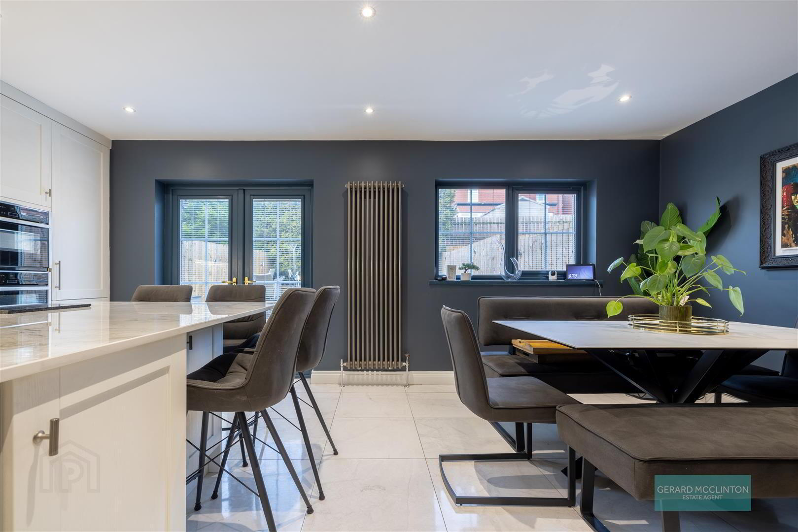 - Double glazed doors to rear patio garden, tiled flooring, shaker style fitted kitchen with extensive range of high and low level units, granite worktop, single sink unit with multi function tap, water filter, large central feature island with waterfall style granite worktop, induction downdraft hob, wine fridge, and range of under counter drawers, dining area with ample space for table and chairs. Two wall mounted television points, wall mounted Hive heating control. feature vertical radiator