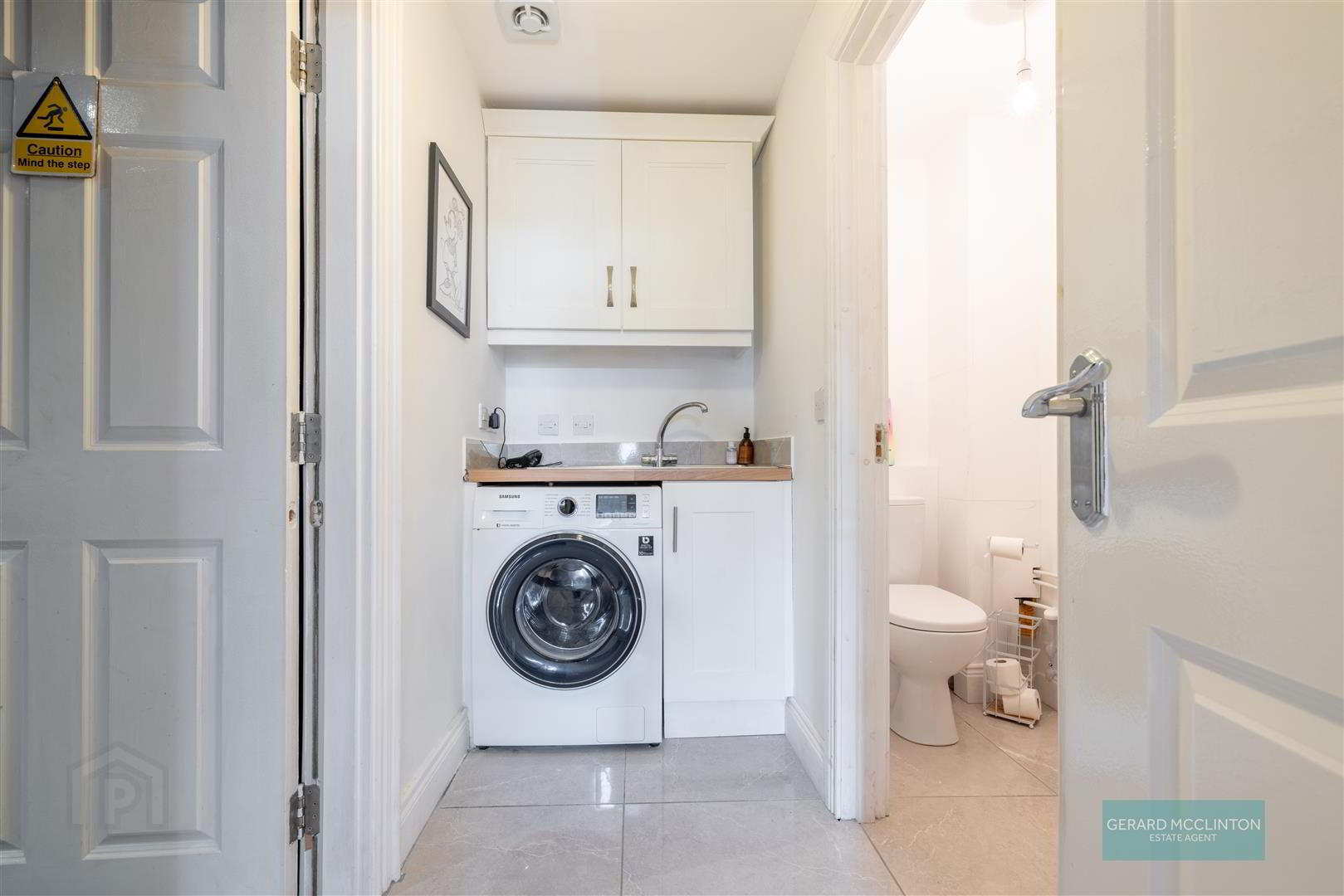 - White close coupled wc, tiled floor, wash hand basin