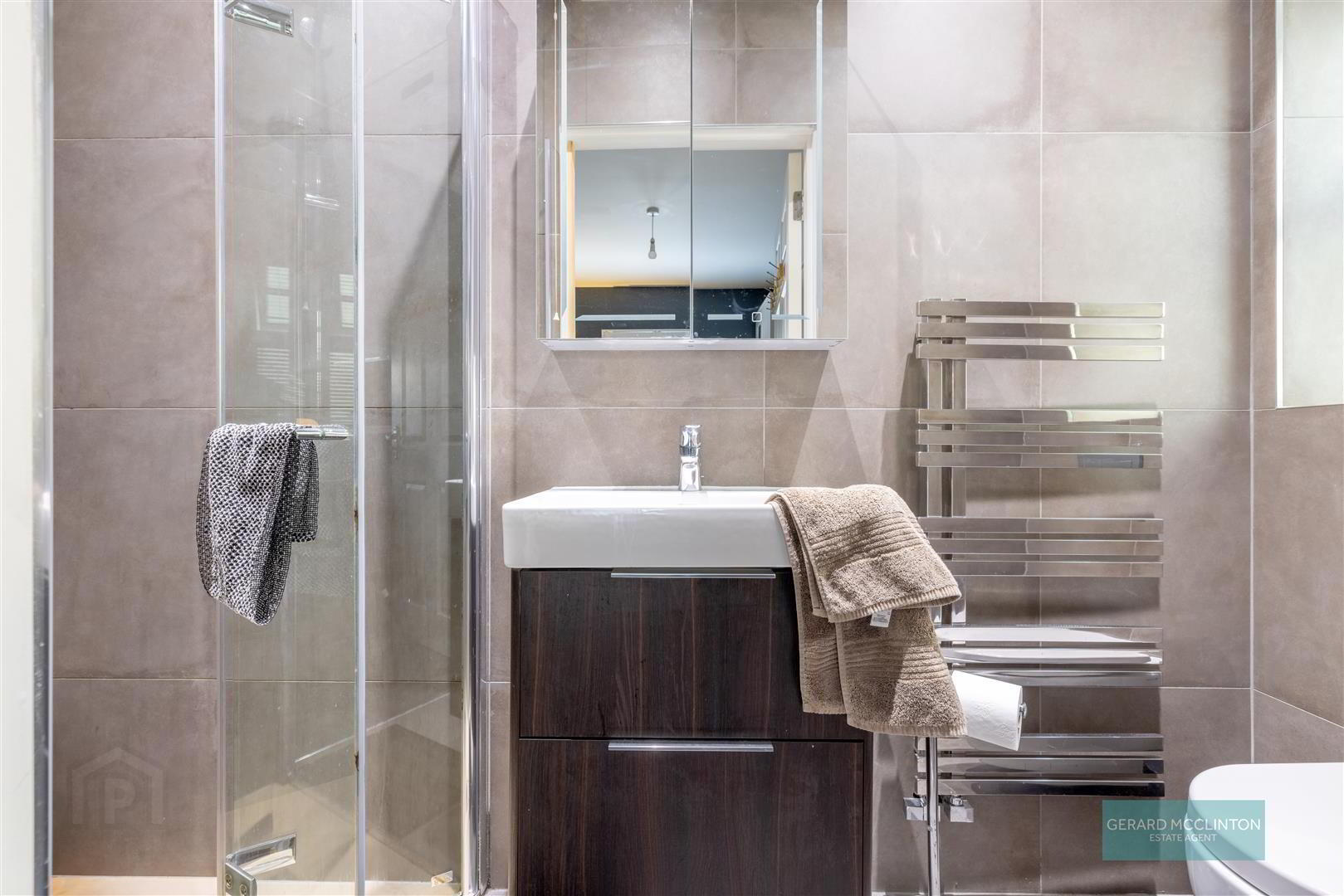 - Modern suite comprising tiled floor, tiled walls, upvc double glazed window, white close coupled wc, wash hand basin with double drawer vanity unit under, shower cubicle with thermostatic shower, vertical heated towel rail & wall mounted LED mirror