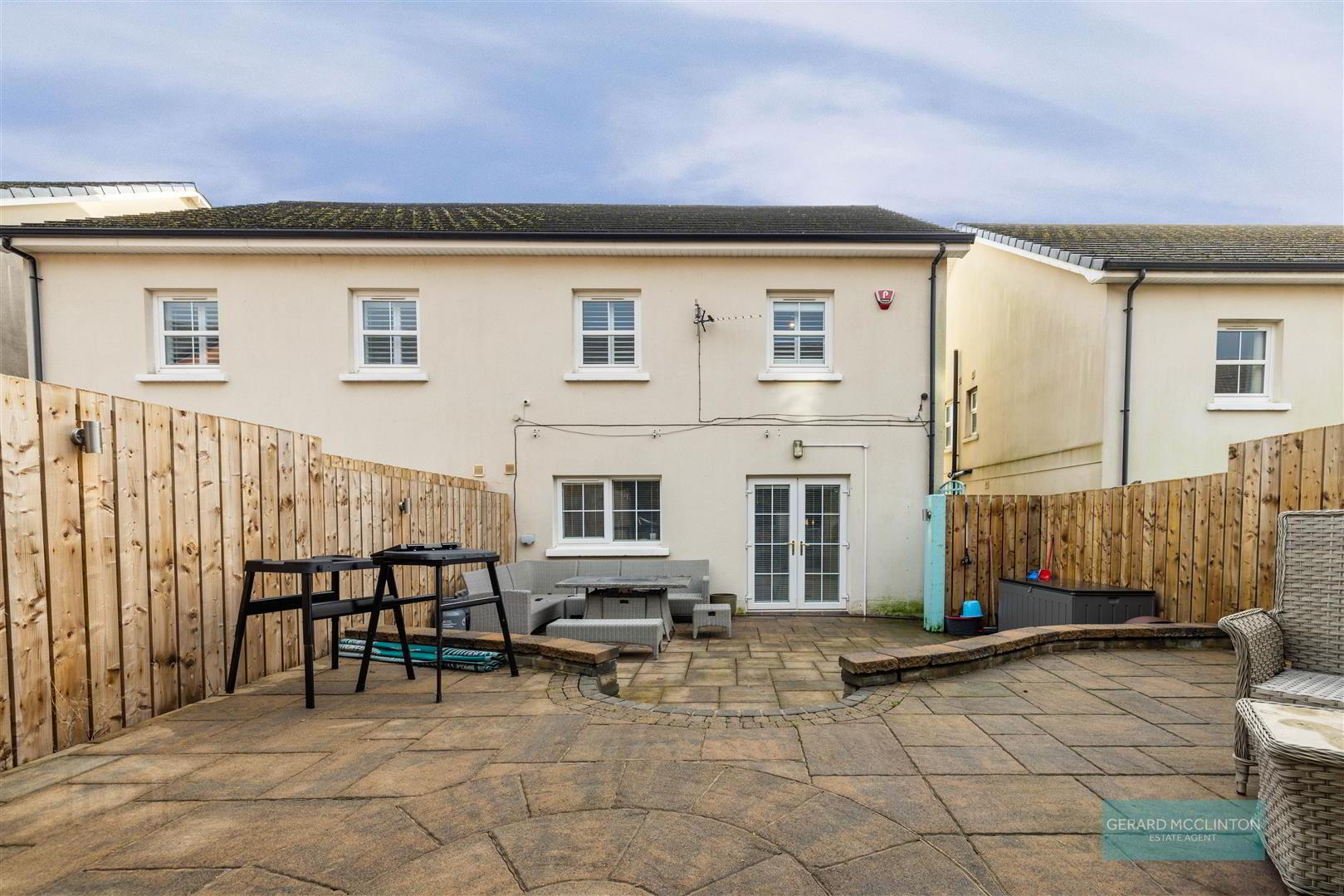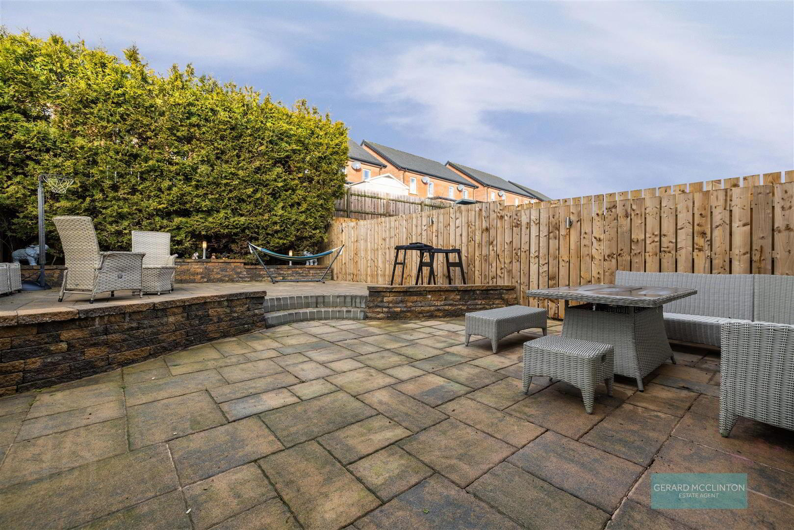 - Enclosed rear paved patio garden with feature raised seating area, the perfect low maintenance entertaining area
