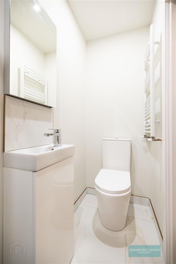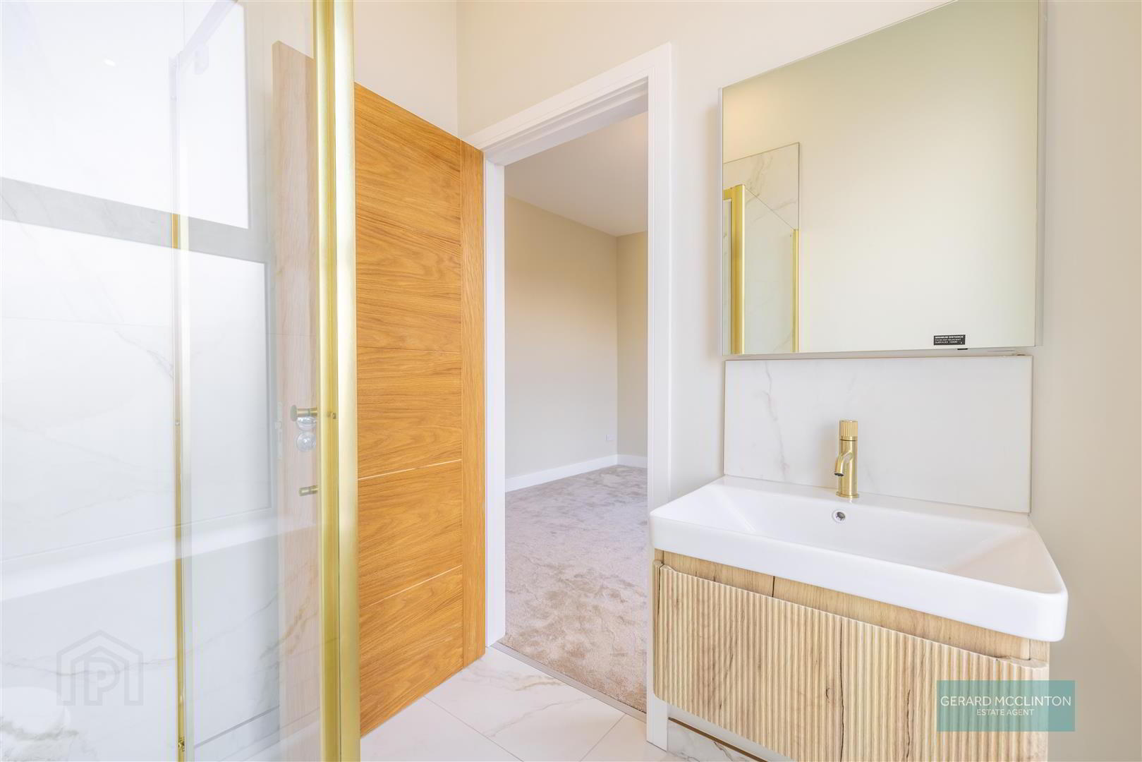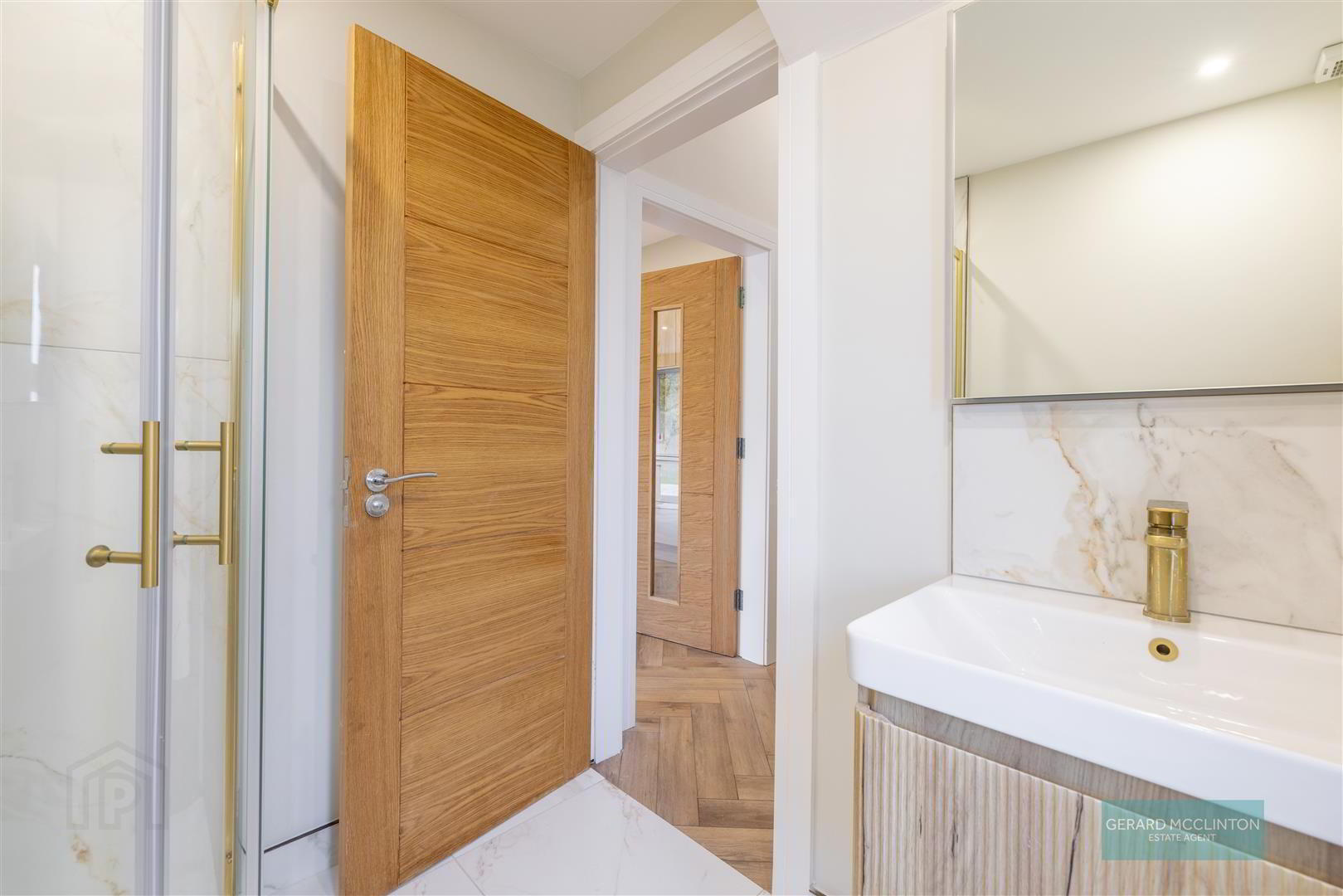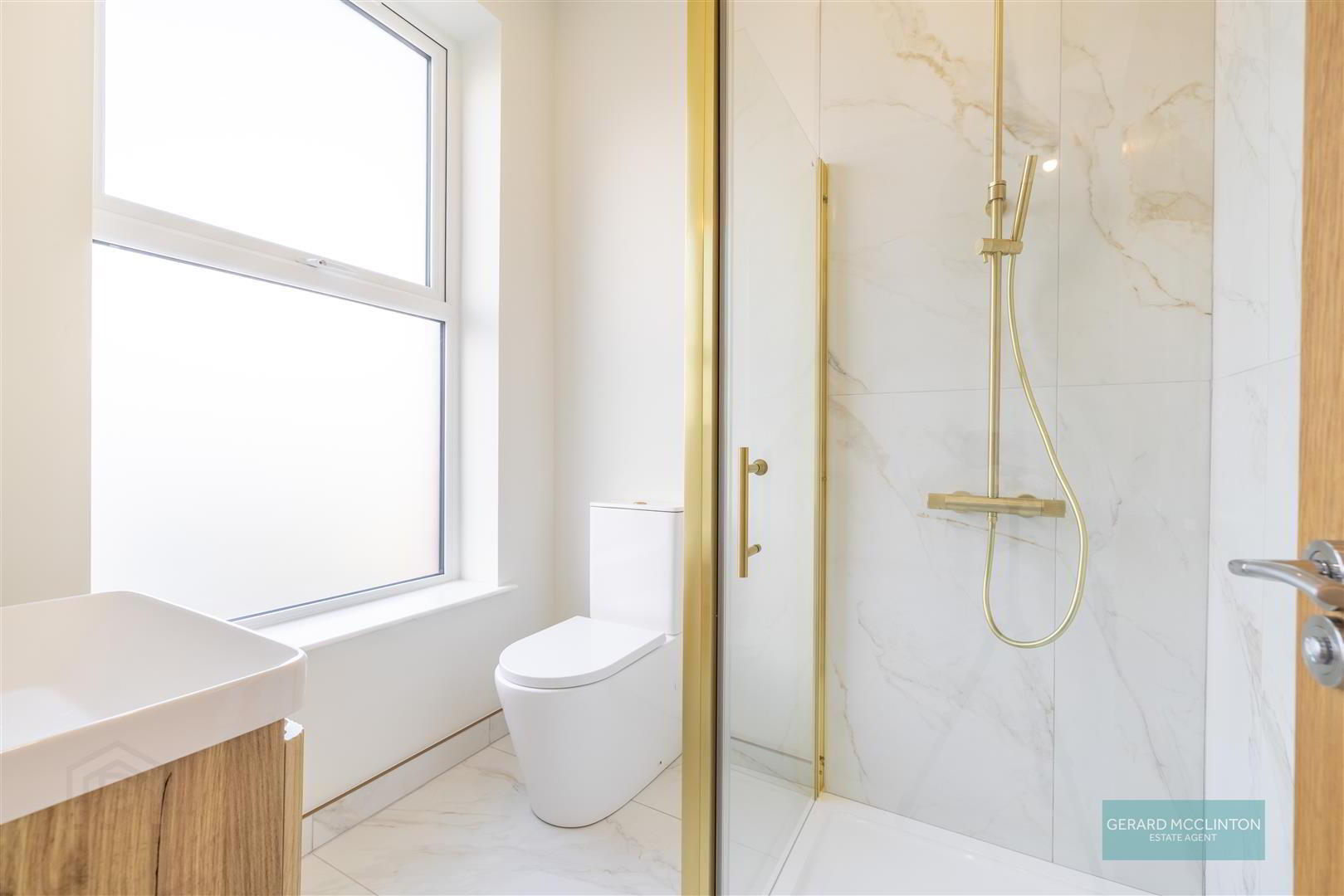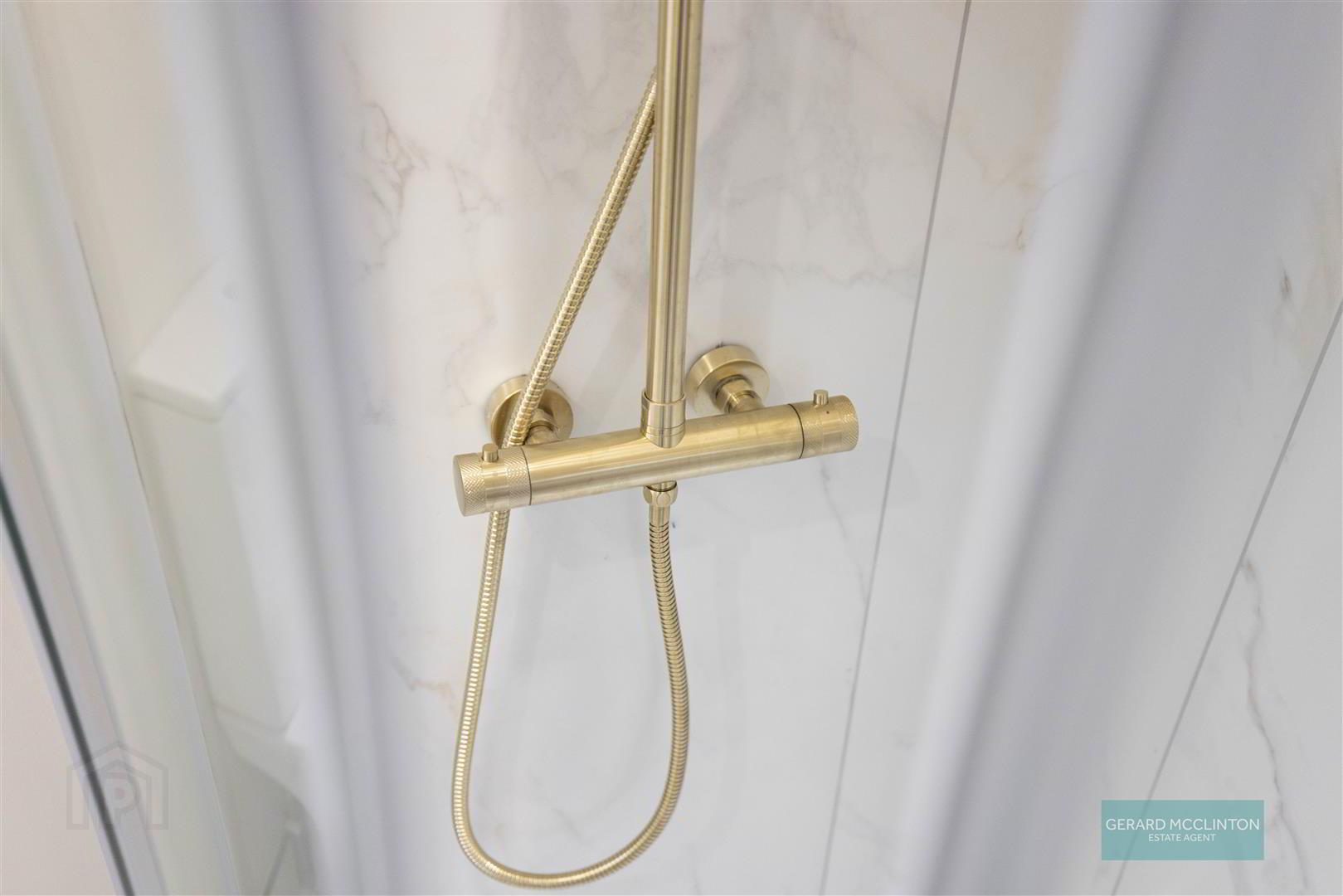 - New suite comprising newly installed double glazed window to front, new tile floor, new shower cubicle with tiled walls, thermostatic shower with oversized rain style shower and separate hand shower attachment, close coupled WC, wash handbasin with fluted vanity unit, wall mounted mirror, spotlights, extractor fan