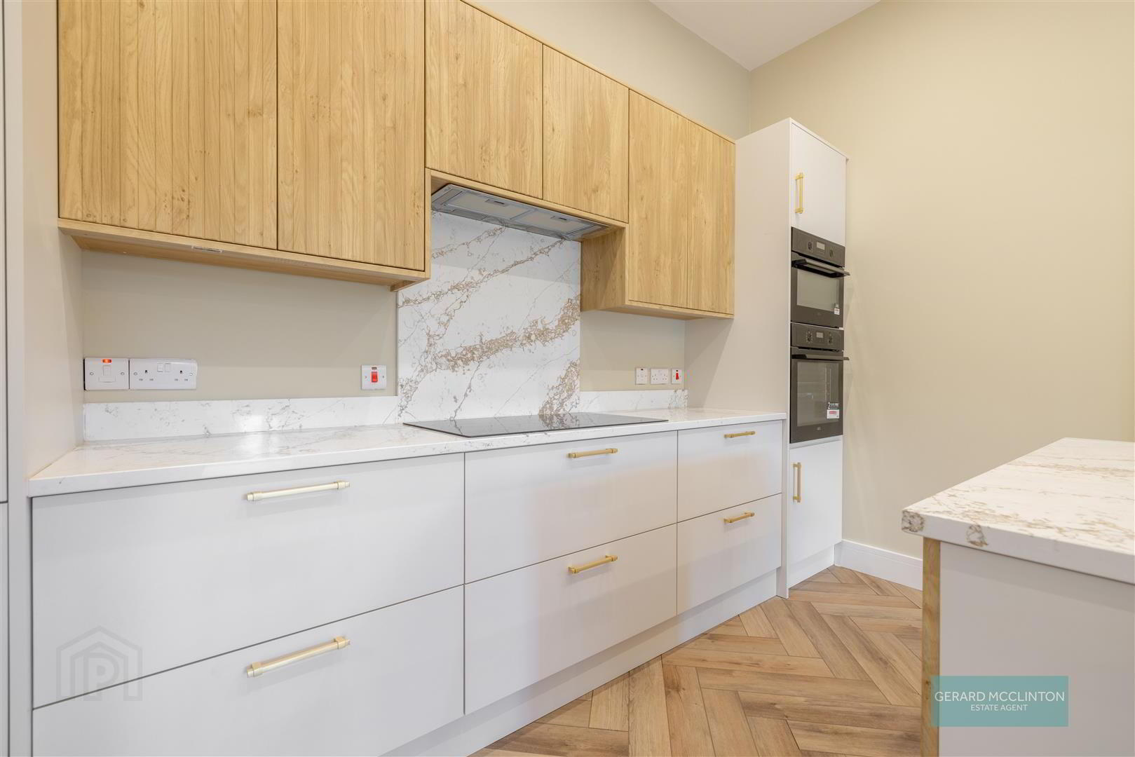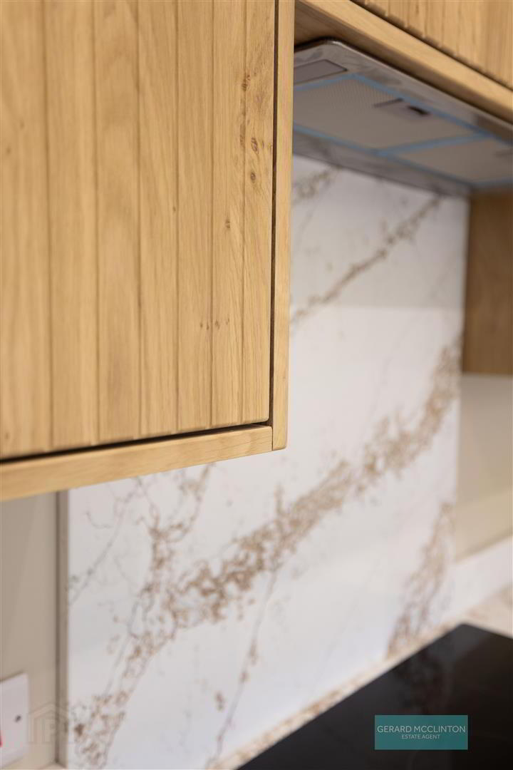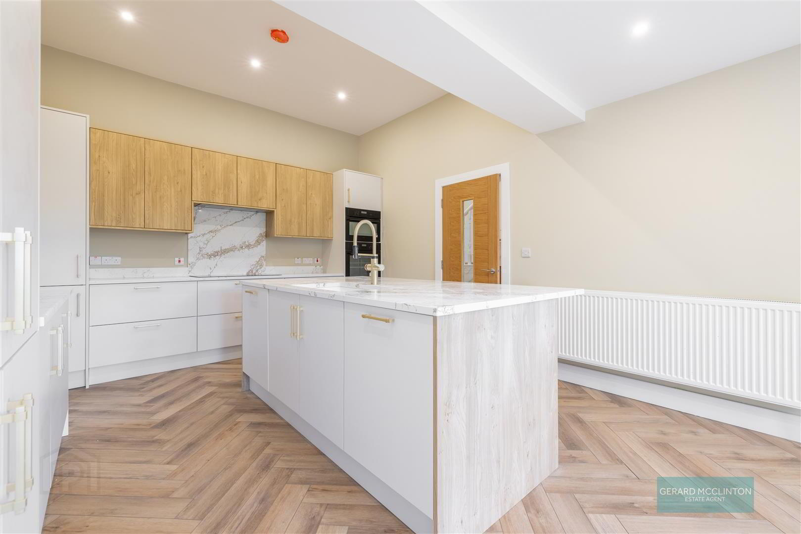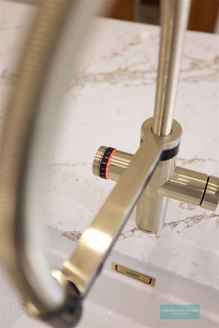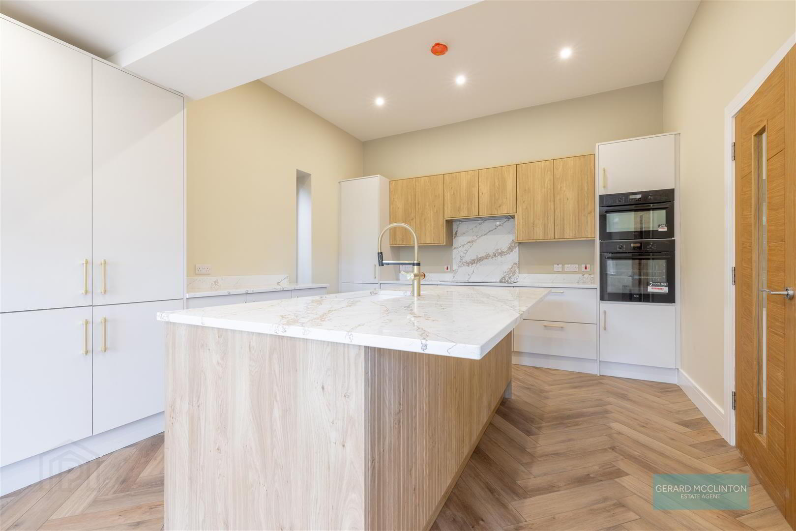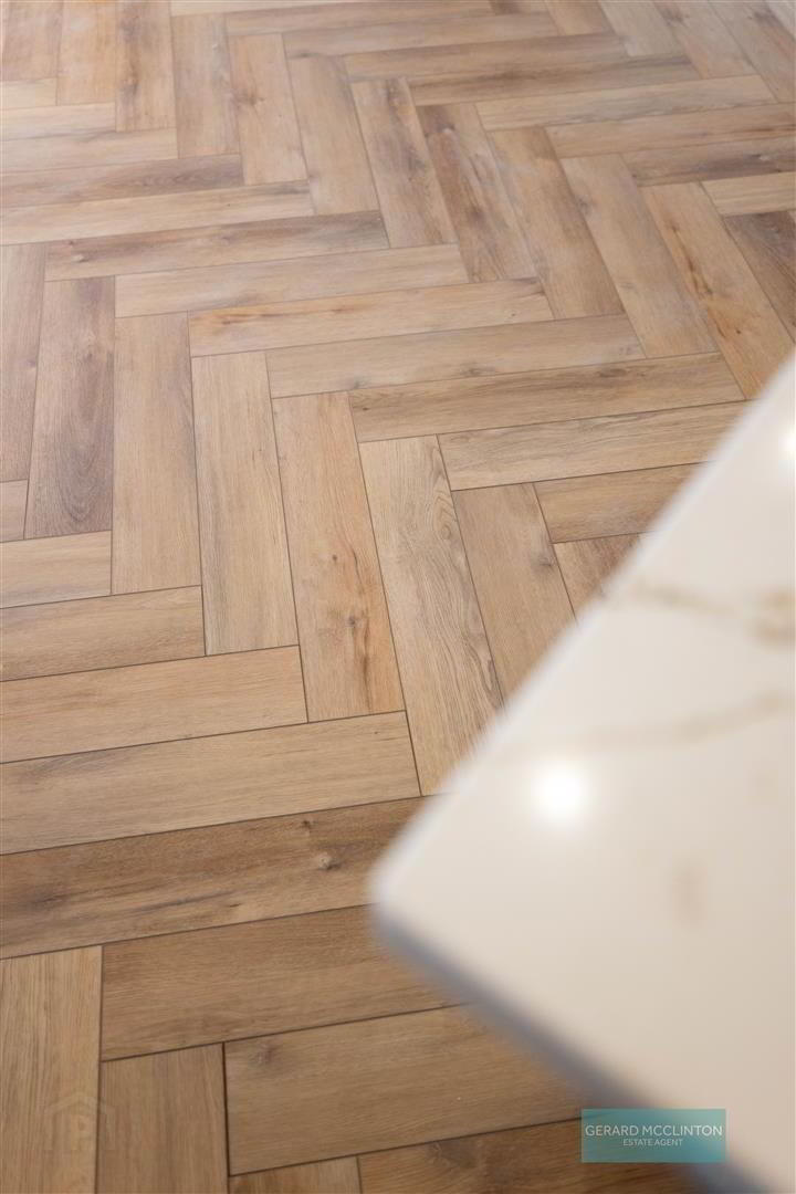 - Brand-new fitted high-quality 2 tone kitchen with fluted wood wall units, soft closed white base units and striking quartz worktop. A range of integrated appliances include double oven, induction hob, extra extractor hood over and integrated fridge freezer. A stunning central island also with quartz worktop benefits from a high specification Blanco tap with multi settings including sparkling water, filtered water, boiling water and normal water. The central-island also has a range of storage underneath and breakfast bar with seating area. The herringbone floor with underfloor insulation continues in this room and leads you to the large double doors overlooking the rear garden. This area is the perfect dining or Family area.