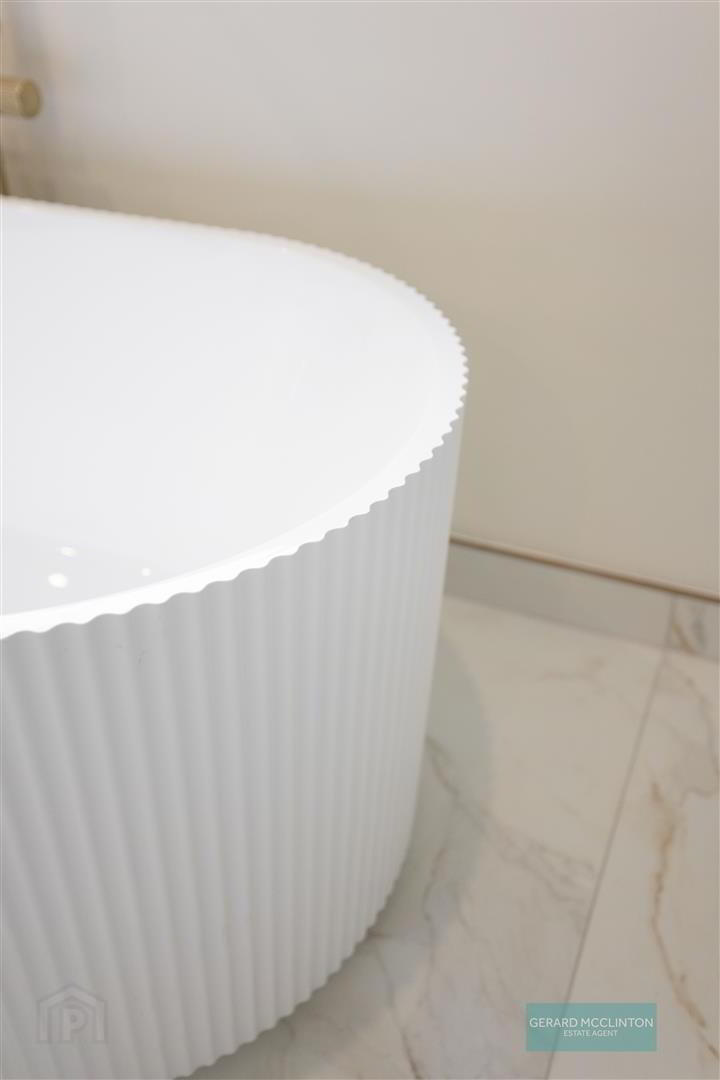 - A clever design, this suite is in two sections, the initial entrance is fitted with new tiled flooring, double glazed window, wash hand basin with gold coloured tap and fluted wooden vanity unit. A wall mounted mirror above the sink. This are was created as a dressing area /make up area. There is space for a vanity unit with mirror and seat. A sliding pocket door reveals the main family bathroom. Comprising the same stunning tiled floor, a feature fluted freestanding bath with central freestanding gold coloured mixer taps, sink unit with matching gold coloured taps and mirror above. A close coupled wc and walk in shower with rain fall style thermostatic shower. Wall mounted gold coloured heated towel rail, spotlights and double glazed window to rear.