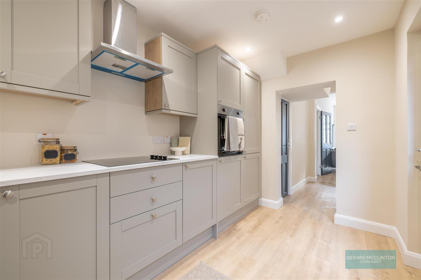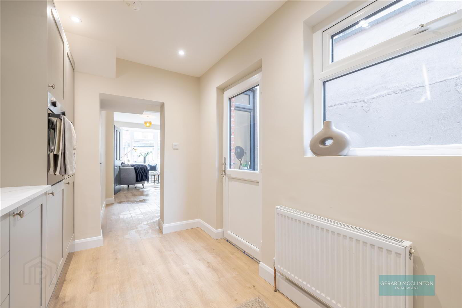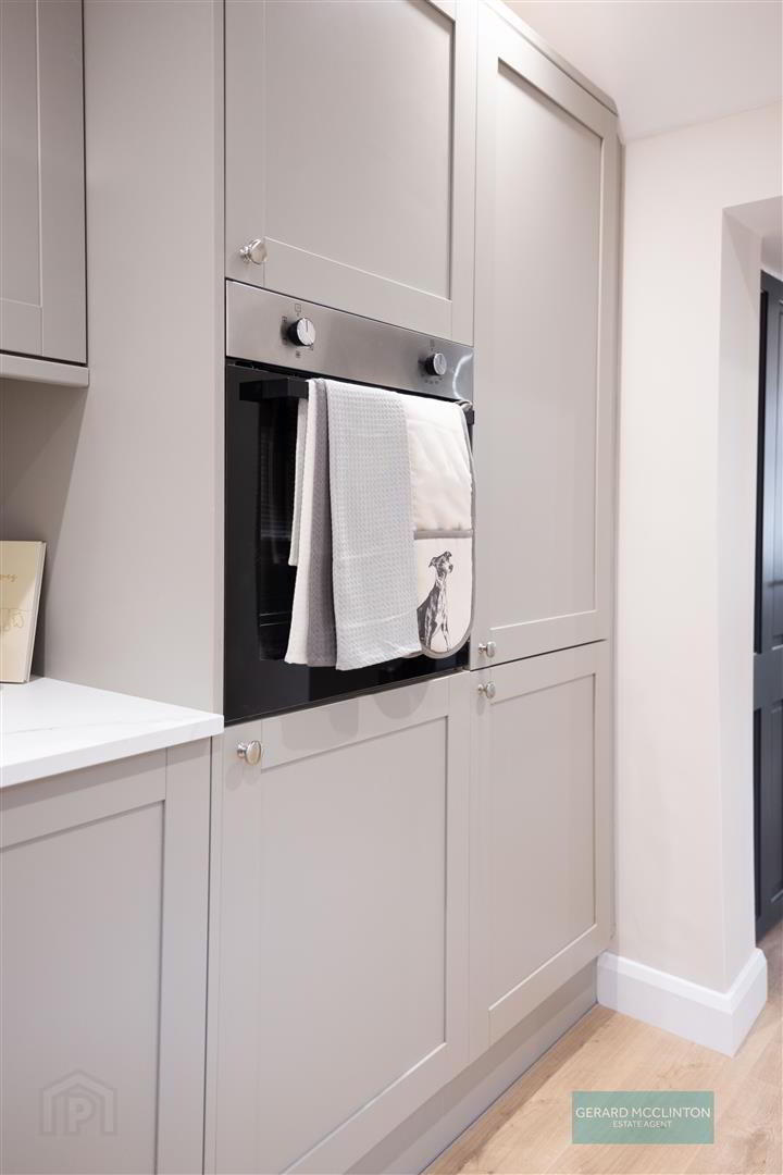 New upvc double glazed window and door to rear yard, new laminate wooden flooring, newly installed kitchen with "pebble" colour soft close units, quartz effect worktops and a range of integrated appliances including fridge freezer, electric oven, 4 ring electric hob, extractor hood over, washing machine and slimline dishwasher. single drainer sink unit with mixer tap, new spotlights, new hardwired smoke detector
