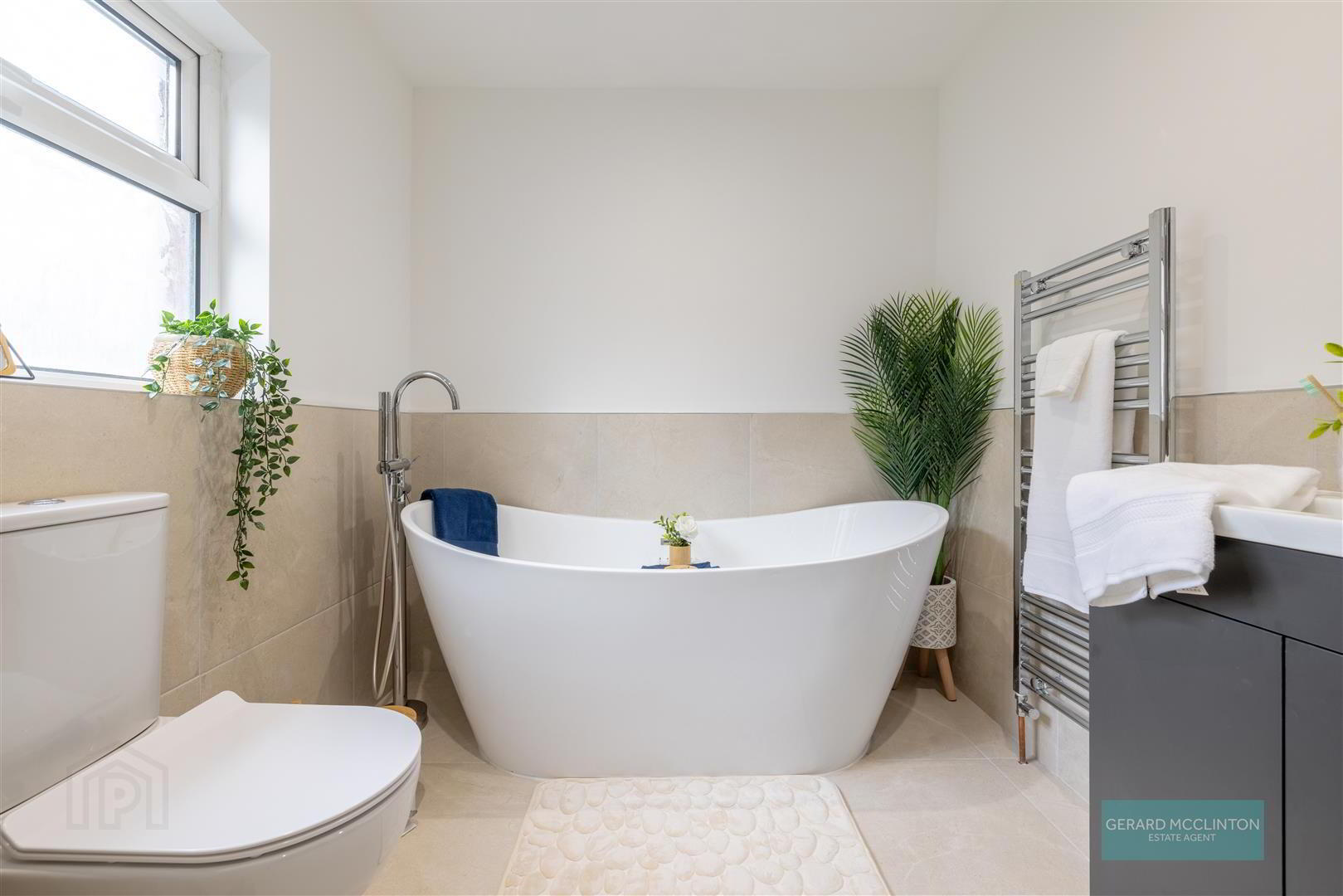 Upstairs, the contemporary bathroom suite feels like something from a boutique hotel, featuring a freestanding bath and a separate shower cubicle — perfect for long soaks or fast mornings.
