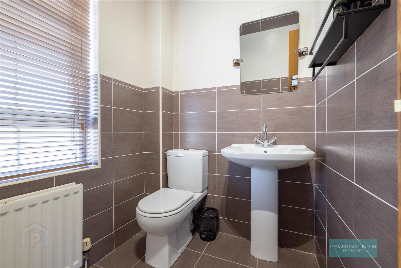 - Double glazed window to front, radiator, tiled floor, tiled walls, pedestal white hand basin with mixer tap, close coupled WC, panelled bath with central mixer tap and hand shower