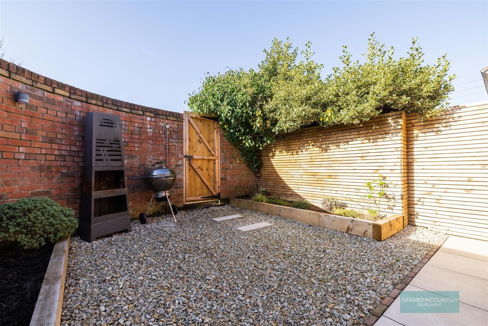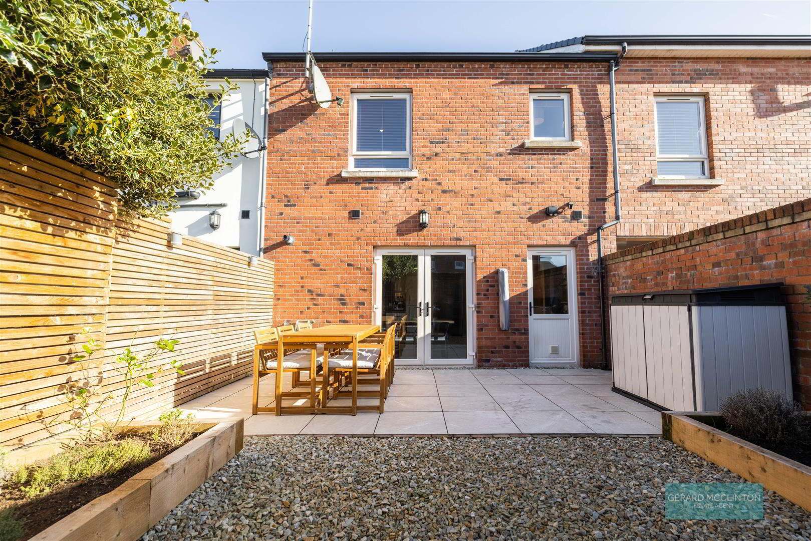 - Rear garden, upgraded recently and comprising half tiled patio area with hidden slot drains, half decorative stone with two sleeper planters, pedestrian gate to residents car parking. Front garden laid with decorative stone.