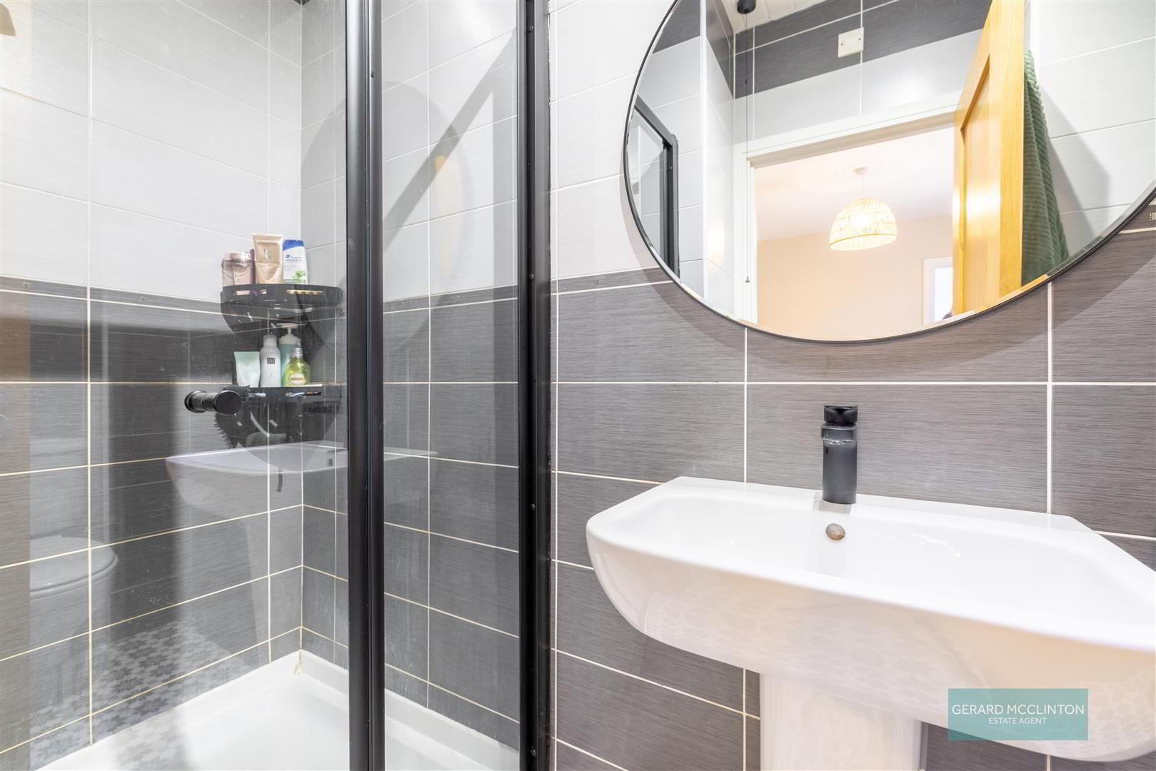 - Tiled floor, tiled walls, modern suite comprising black framed Shower cubicle with thermostatic shower. Wash hand basin with mono style mixer tap. Close coupled low flush wc