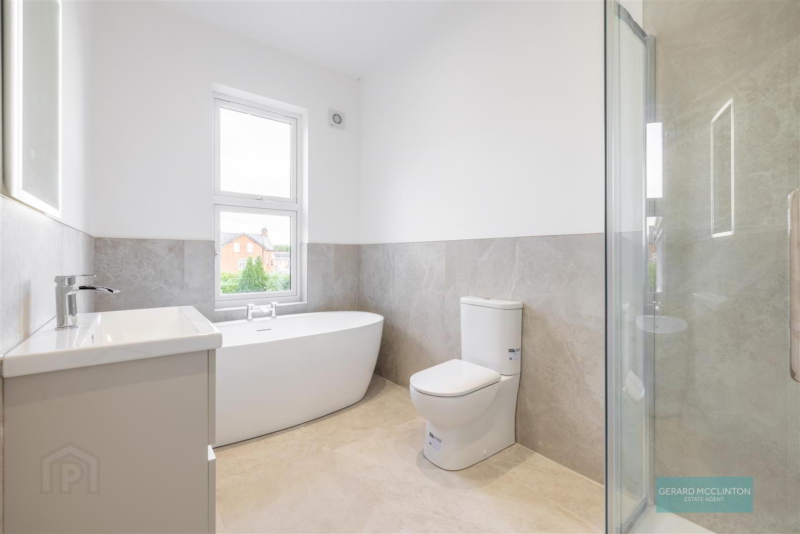 New Upvc double glazed window to rear, new tiling, new suite comprising attractive freestanding bath with mixer taps, close coupled wc, wash hand basin with vanity unit, shower cubicle with thermostatic rain style shower and separate hand shower attachment, heated towel rail, large separate storage area