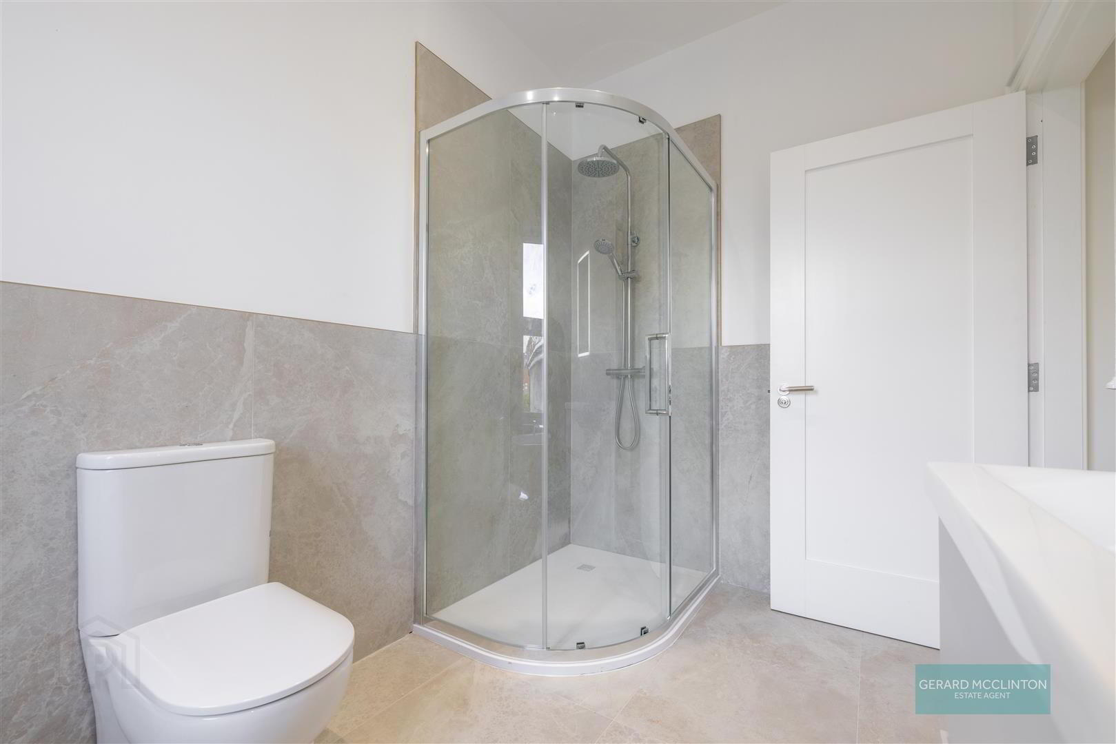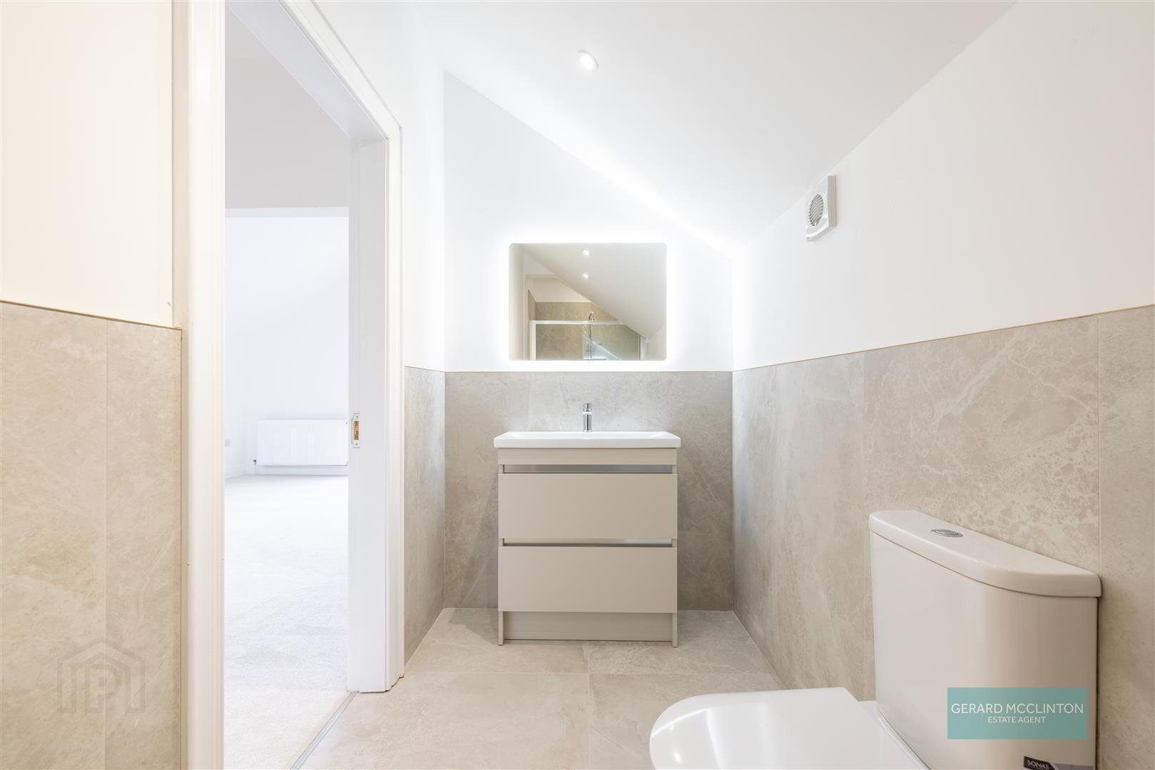 Spacious en suite comprising brand new double shower cubicle with rain style shower and separate hand shower, wash hand basin with vanity unit, close coupled wc, new tiled flooring & part tiled walls, Led wall mirror,