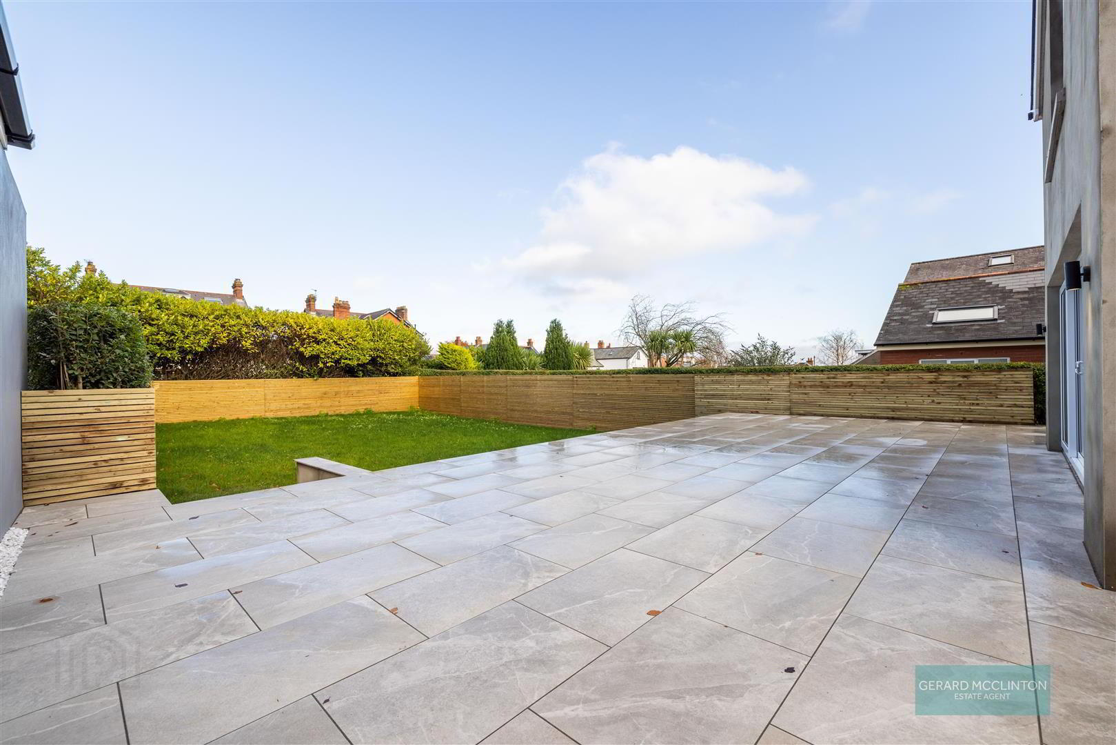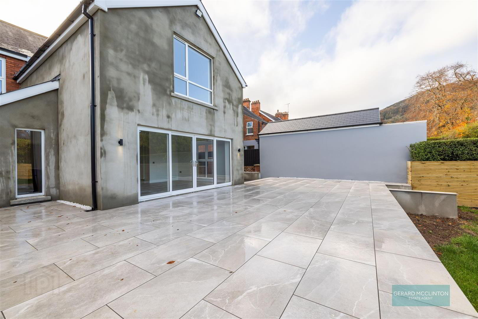 Rear: New raised paved patio area leading to enclosed garden with Venetian style fencing with stunning views to Cavehill
