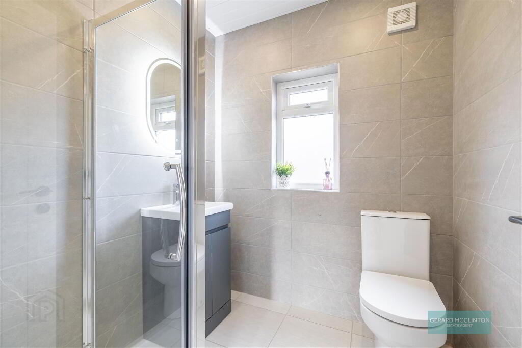 Double glazed upvc window, newly tiled floor, newly tiled walls, new heated towel rail, new suite comprising contemporary shower cubicle with thermostatic shower, a close coupled wc, modern wash hand basin with mixer tap and vanity unit and bluetooth wall mounted LED mirror