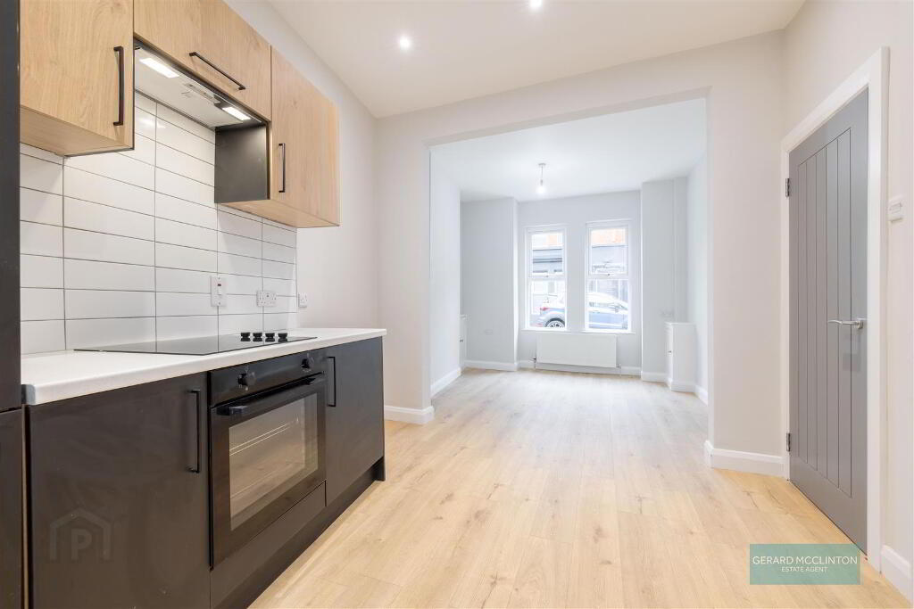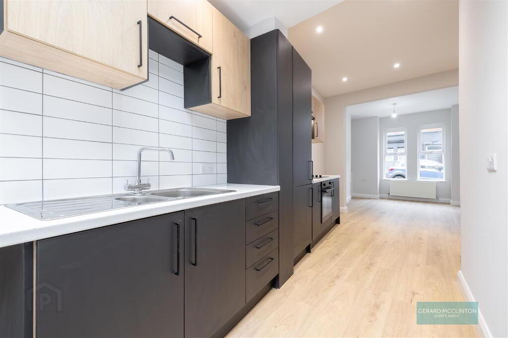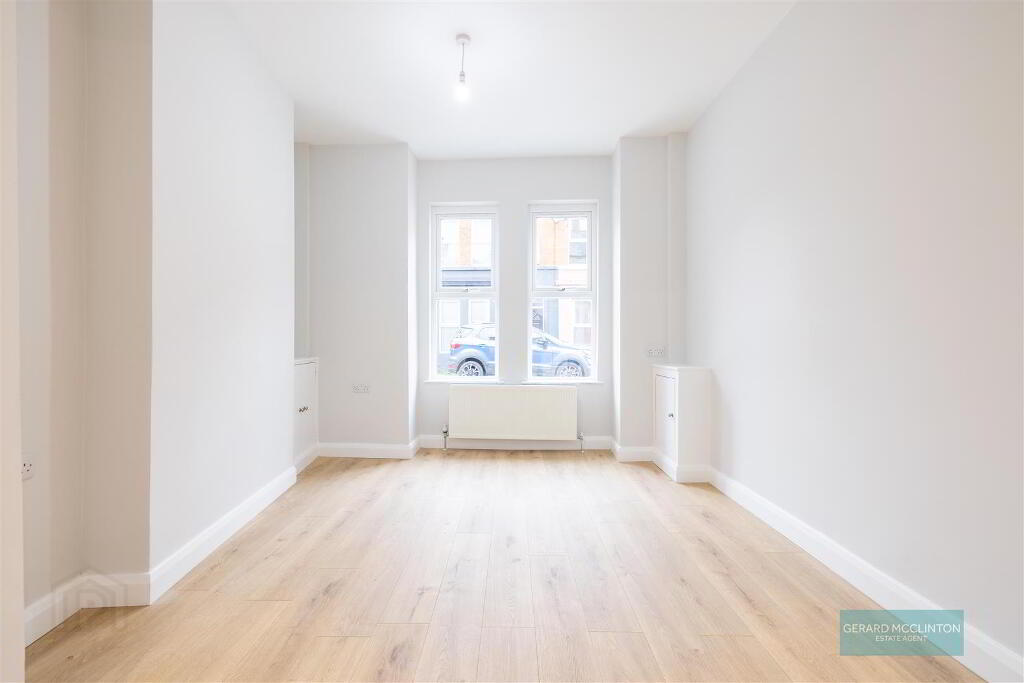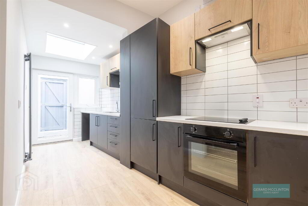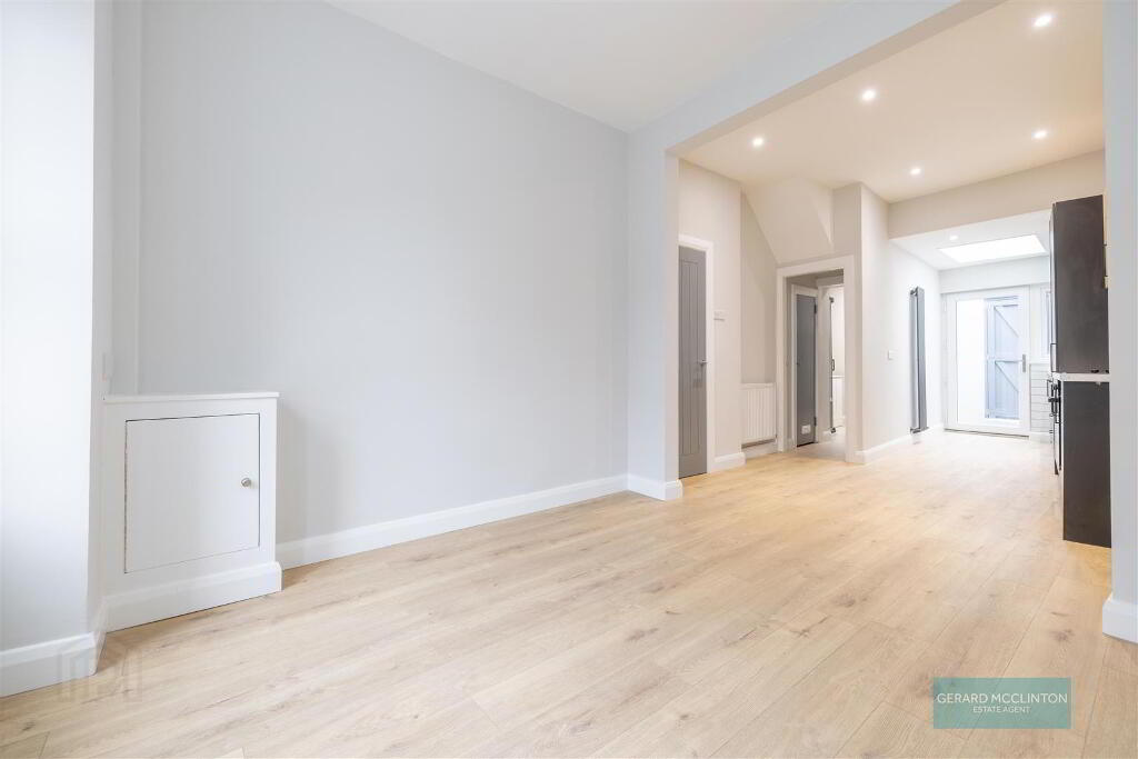 2 x UPVC double glazed windows to front, new laminate wooden floor, enclosed Gas meter box and electric cupboard, 2.8m high ceilings, new internal door, 3 x radiators including contemporary grey vertical radiator. The kitchen comprises brand-new two tone range of wall and base units, integrated 4 ring electric hob, electric oven, extractor hood and fridge freezer. There is space and plumbing for washing machine. Part tiled walls, single drainer sink unit with mixer tap, spotlights, new roof window install installed, newly redecorated, double glazed door and window to rear yard.