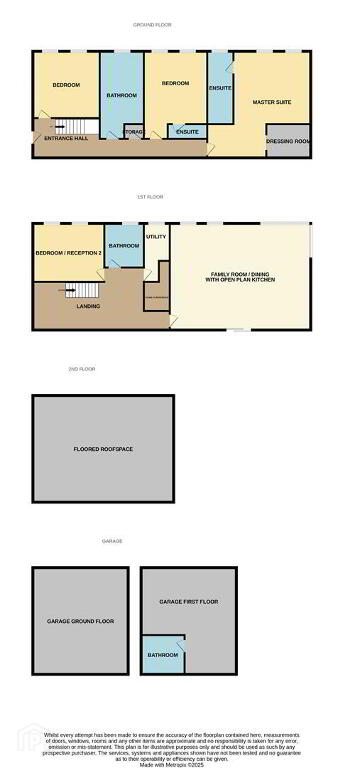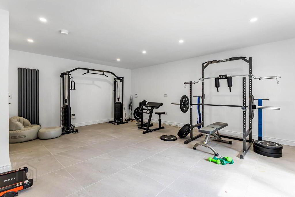 There is also a floored roof space via fixed staircase with light, power and plumbing for radiators and garage with first floor space, currently used as a gym. This area also has a separate room with plumbing for shower and wc.