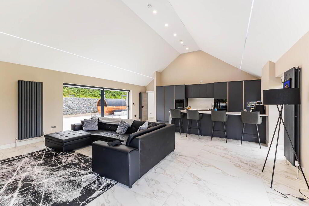 A sleek floor-to-ceiling radiator adds a modern architectural touch, while the carefully concealed control room provides discreet access to the property’s essential systems, including the pressurised water cylinder, electric meter, and integrated control panels.