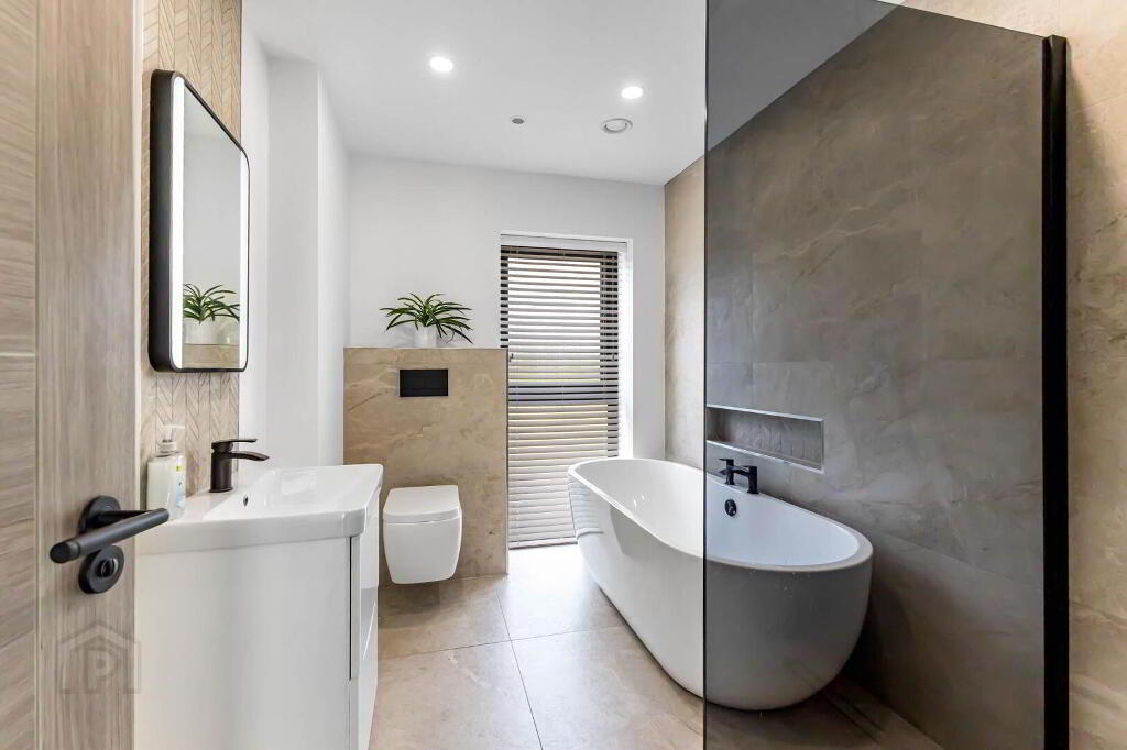A statement of refined contemporary design, this stunning bathroom is finished to an exceptional standard, blending modern textures with timeless elegance. The white suite features a sleek wall-hung WC with push-button flush and a floating wash hand basin set within a bespoke vanity unit, enhanced by a matt black mixer tap and stylish tiled splashback for a bold, design-led finish.