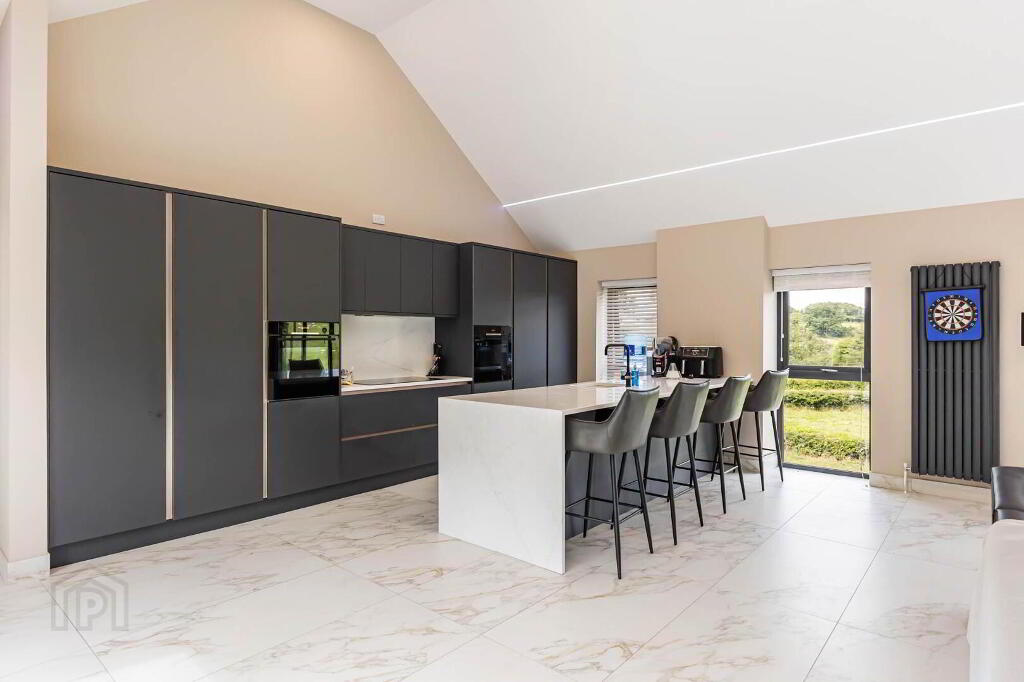 A sleek breakfast bar with quartz surface provides a relaxed dining option, complemented by an inset sink with matt black mixer tap and space for a wine fridge — ideal for entertaining. The tiled flooring continues throughout, creating a seamless connection between kitchen and living zones.