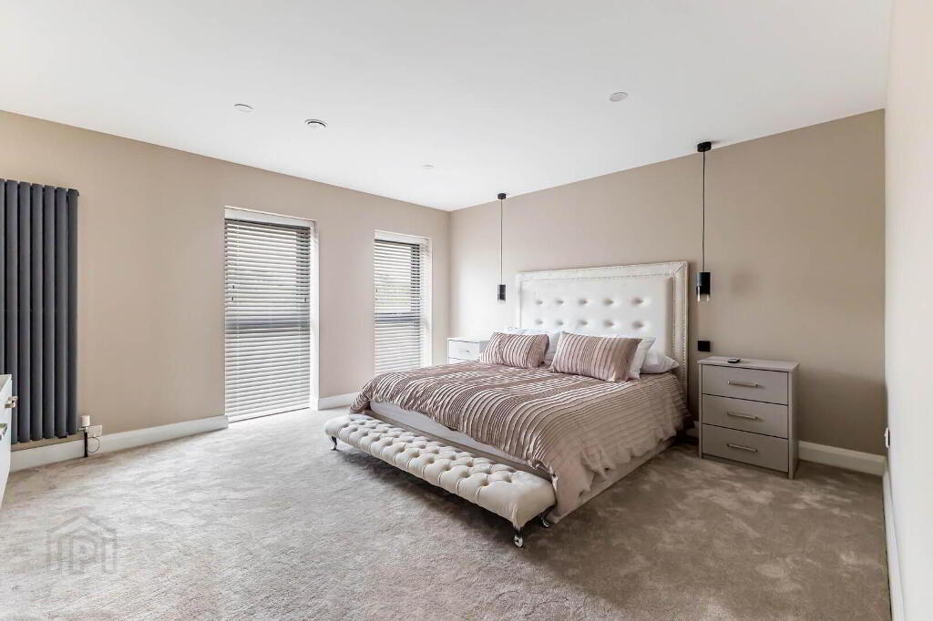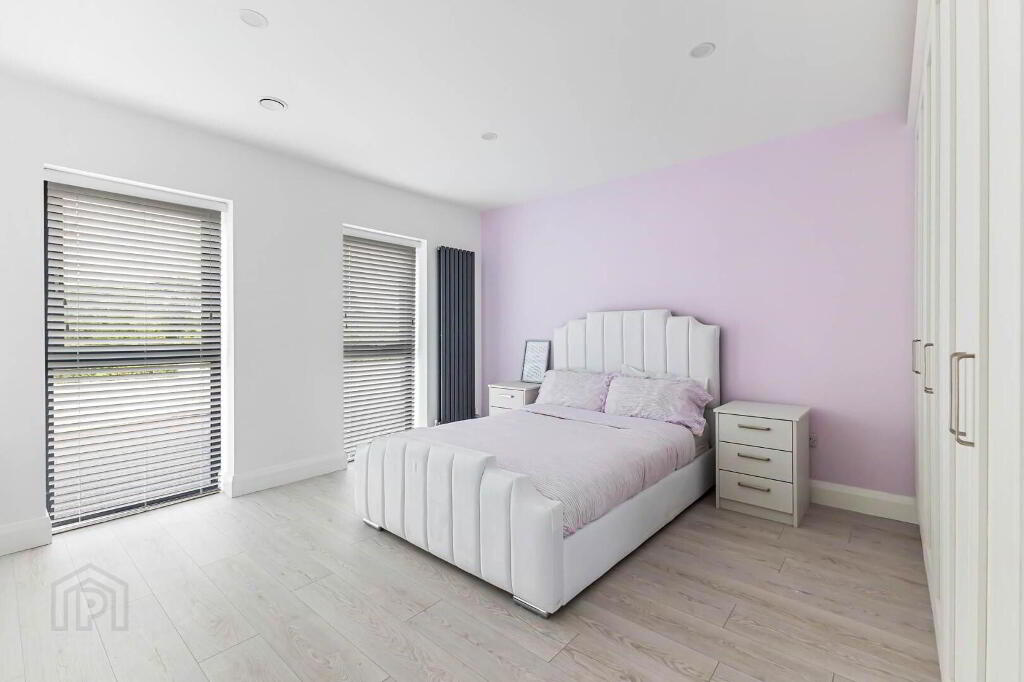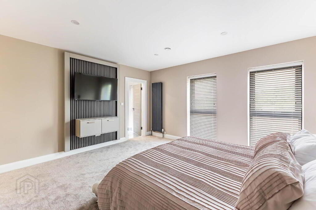 The floor is finished in elegant laminate wood-effect, perfectly complementing the contemporary décor, while a thoughtfully designed range of built-in wardrobes provides seamless storage without compromising style. Subtle low-voltage recessed spotlighting creates a warm, ambient glow, and a floor-to-ceiling radiator adds a modern, sculptural touch to the room.