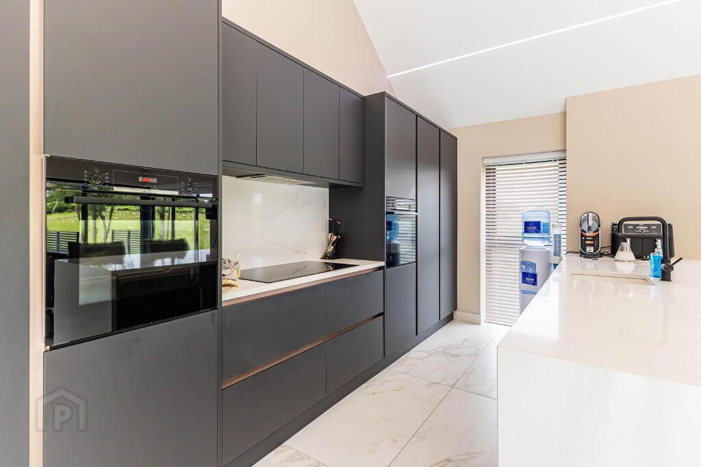 The bespoke, fully fitted kitchen features a stunning range of high and low-level units topped with quartz worktops and matching upstands. A high-level double oven and grill, ceramic Belling hob with integrated extractor, and full-length built-in fridge and freezer combine style with practicality, while the dedicated larder storage ensures a clutter-free workspace.