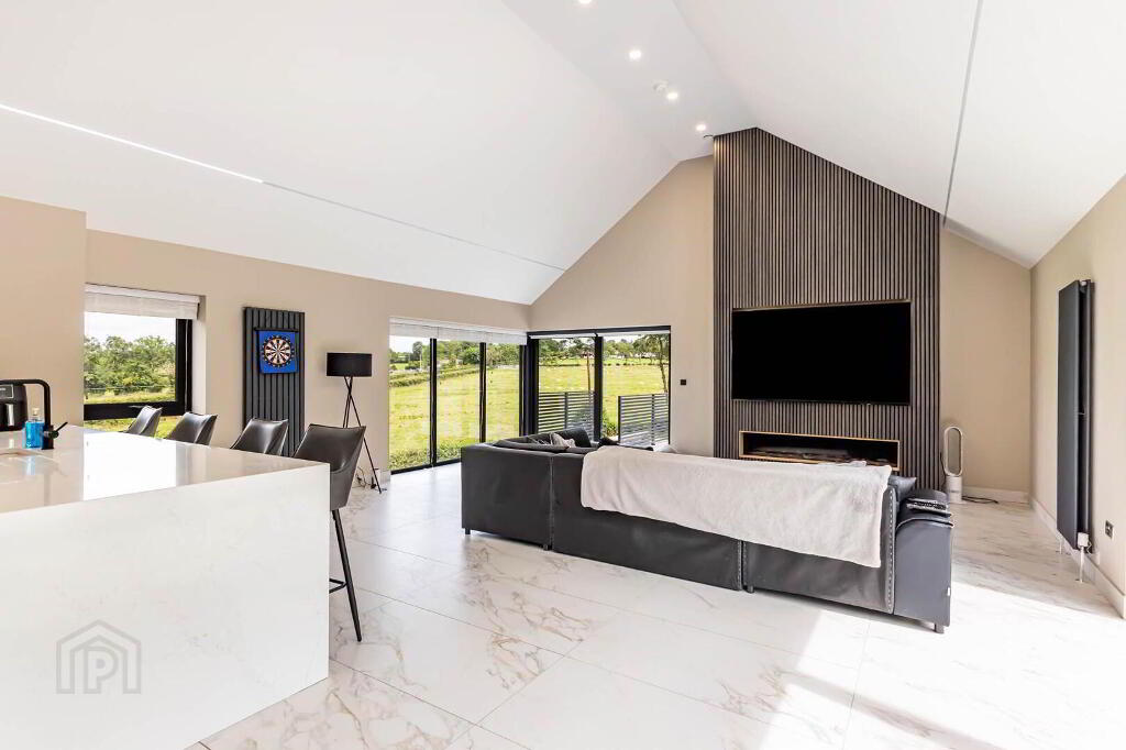 Two sets of uPVC sliding doors open effortlessly onto the rear patio, extending the living space outdoors — perfect for summer gatherings or quiet morning coffee moments. The striking vaulted ceiling enhances the sense of scale and light, while a contemporary built-in gas coal-effect fire provides warmth and atmosphere.