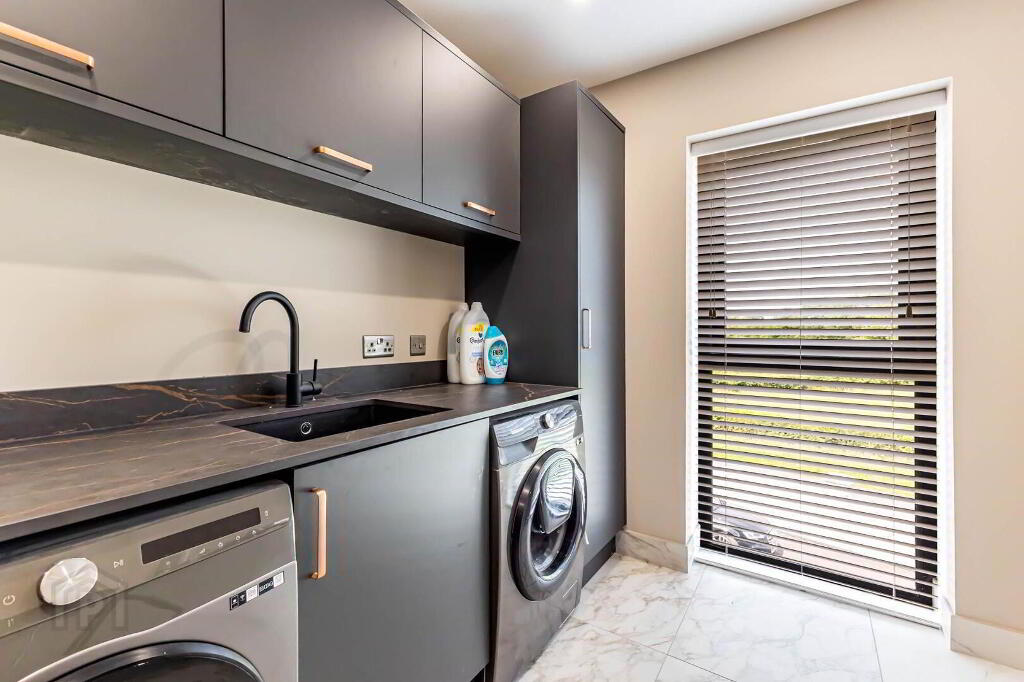 A dedicated laundry area offers integrated appliance space, quartz-effect work surfaces, and a deep stainless steel sink with chrome mixer tap — ideal for everyday convenience. Subtle low-voltage recessed lighting and a modern floor-to-ceiling radiator elevate the room’s ambience, ensuring that even the home’s most functional spaces exude the same sense of quality and refinement found throughout the property.