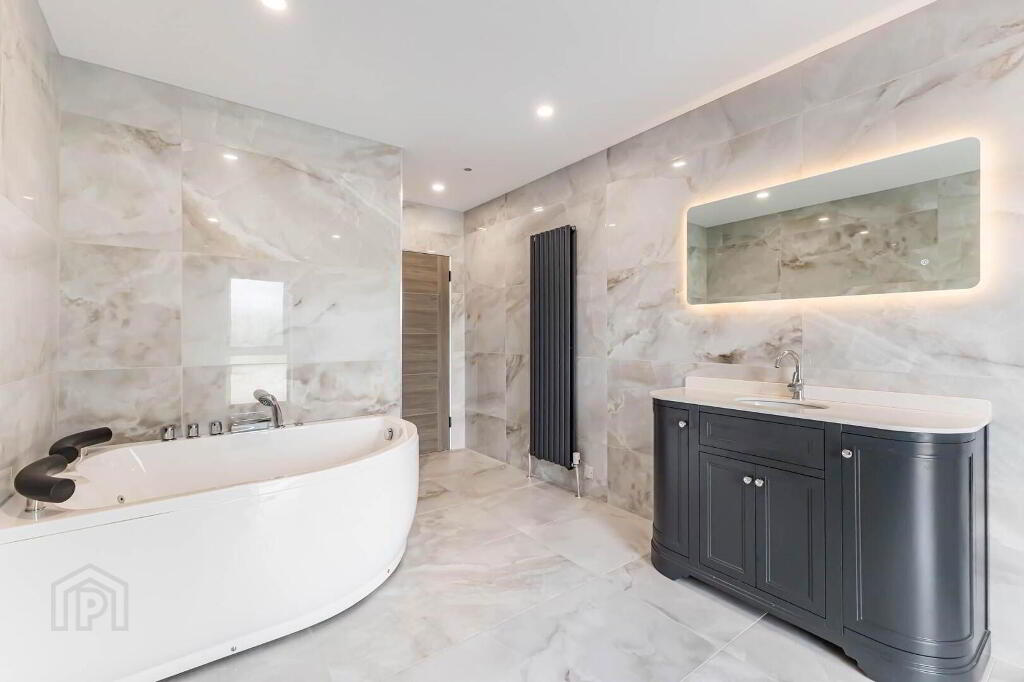 Fully tiled walls and a matching tiled floor create a sense of continuity and sophistication, while a floor-to-ceiling radiator adds both warmth and a sculptural feature. The centerpiece is a sumptuous jacuzzi bath, complete with chrome thermostatic controls, soothing water jets, and a convenient telephone attachment — perfect for unwinding in ultimate comfort.