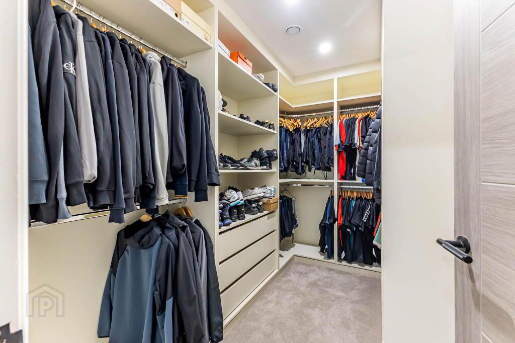 A bespoke built-in vanity unit adds elegance and functionality, while the walk-in wardrobe is thoughtfully designed with a range of built-in pull-out storage, integrated railings, and cabinets — perfectly combining organisation with style. This suite exemplifies luxury living, offering both comfort and refined practicality
