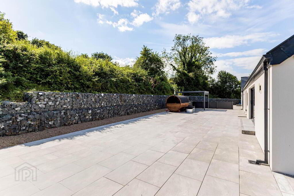 Approached via double electric gates, the property is introduced by a sweeping tarmac driveway, providing an impressive arrival and ample private parking for several vehicles. To the rear lies a secluded, professionally landscaped patio garden with outdoor kitchen area — perfectly designed for relaxation and entertaining. This area enjoys a southerly aspect, framed by elegant stone retaining walls, and complete with outside lighting, power points, and a water supply for added convenience.