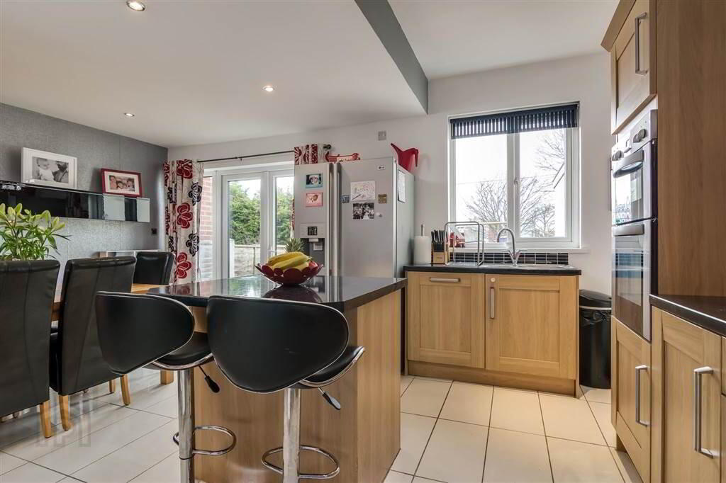 The ground floor offers a formal living room to the front, to the rear is a modern shaker-style kitchen with appliances and central island, flowing seamlessly into the spacious dining/family room – ideal for entertaining or relaxed family living. Upstairs, three bedrooms and a contemporary family bathroom complete the accommodation.
