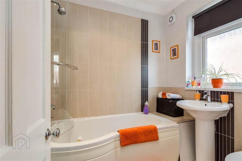 Upvc double glazed window, ceramic tiled floor, part tiled walls, low flush WC, pedestal wash hand basin, panel bath with shower screen and power shower over, cornicing, spotlighting, extractor.