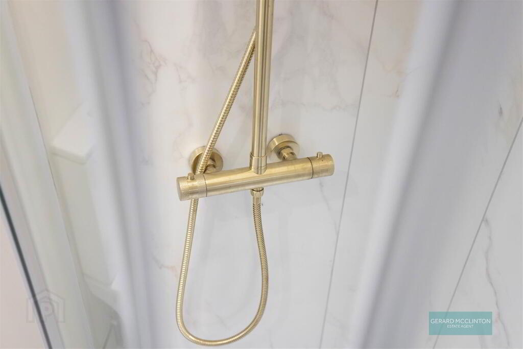 New suite comprising newly installed double glazed window to front, new tile floor, new shower cubicle with tiled walls, thermostatic shower with oversized rain style shower and separate hand shower attachment, close coupled WC, wash handbasin with fluted vanity unit, wall mounted mirror, spotlights, extractor fan