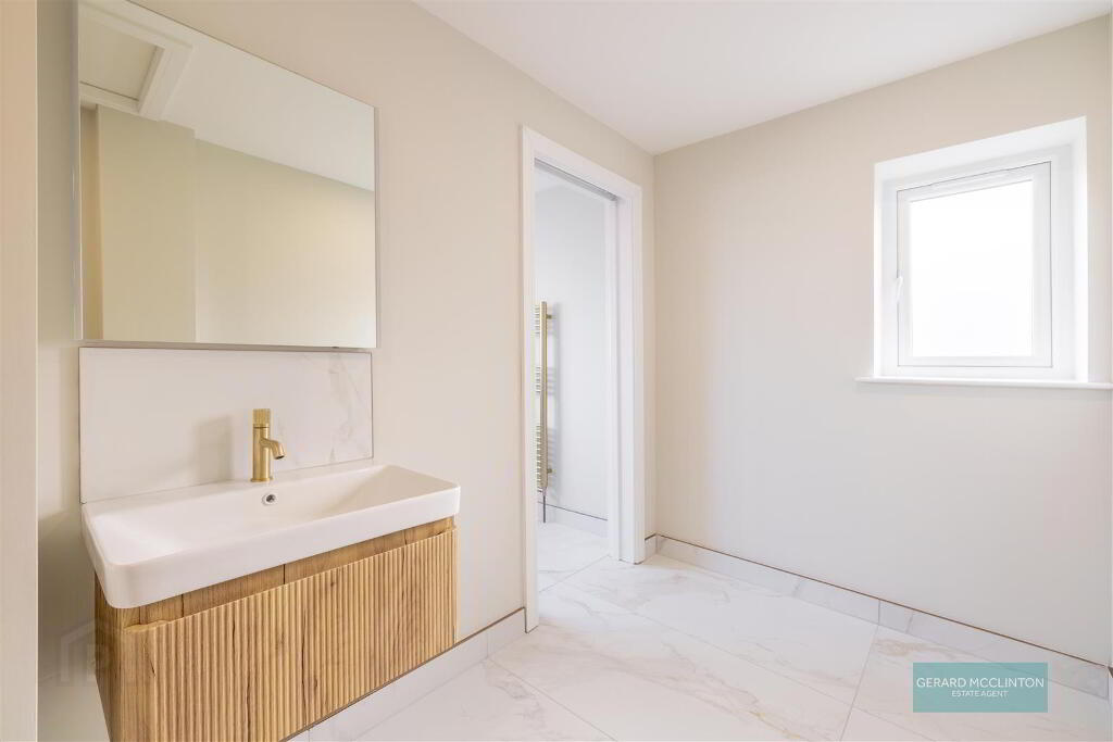 A clever design, this suite is in two sections, the initial entrance is fitted with new tiled flooring, double glazed window, wash hand basin with gold coloured tap and fluted wooden vanity unit. A wall mounted mirror above the sink. This are was created as a dressing area /make up area. There is space for a vanity unit with mirror and seat. A sliding pocket door reveals the main family bathroom. Comprising the same stunning tiled floor, a feature fluted freestanding bath with central freestanding gold coloured mixer taps, sink unit with matching gold coloured taps and mirror above. A close coupled wc and walk in shower with rain fall style thermostatic shower. Wall mounted gold coloured heated towel rail, spotlights and double glazed window to rear.