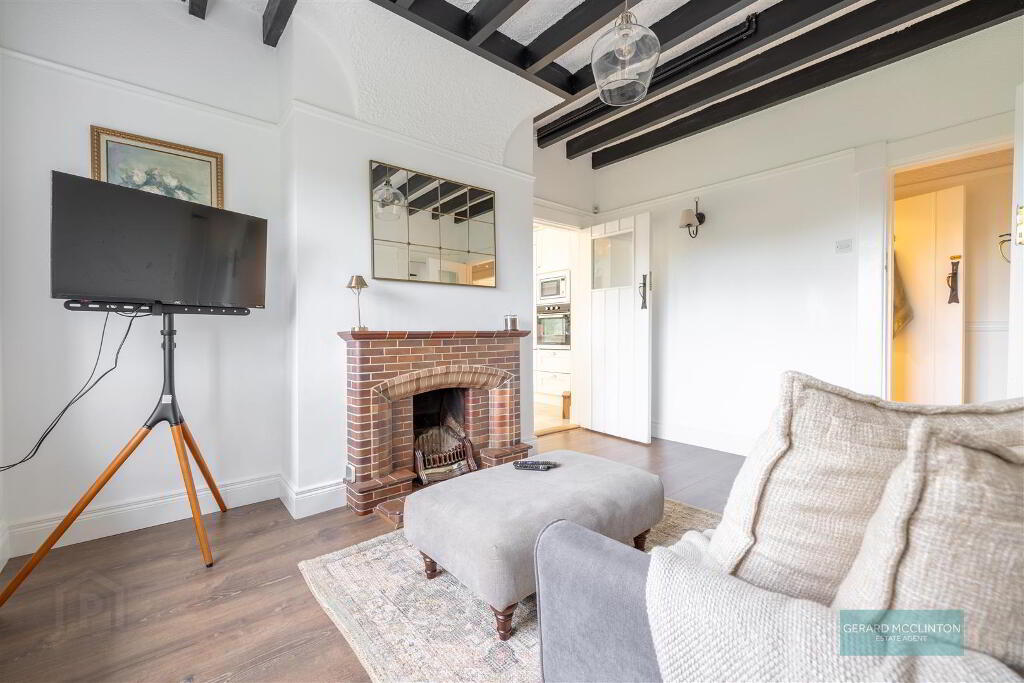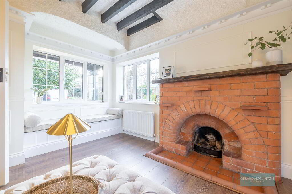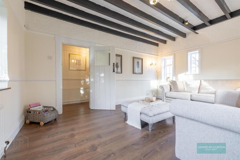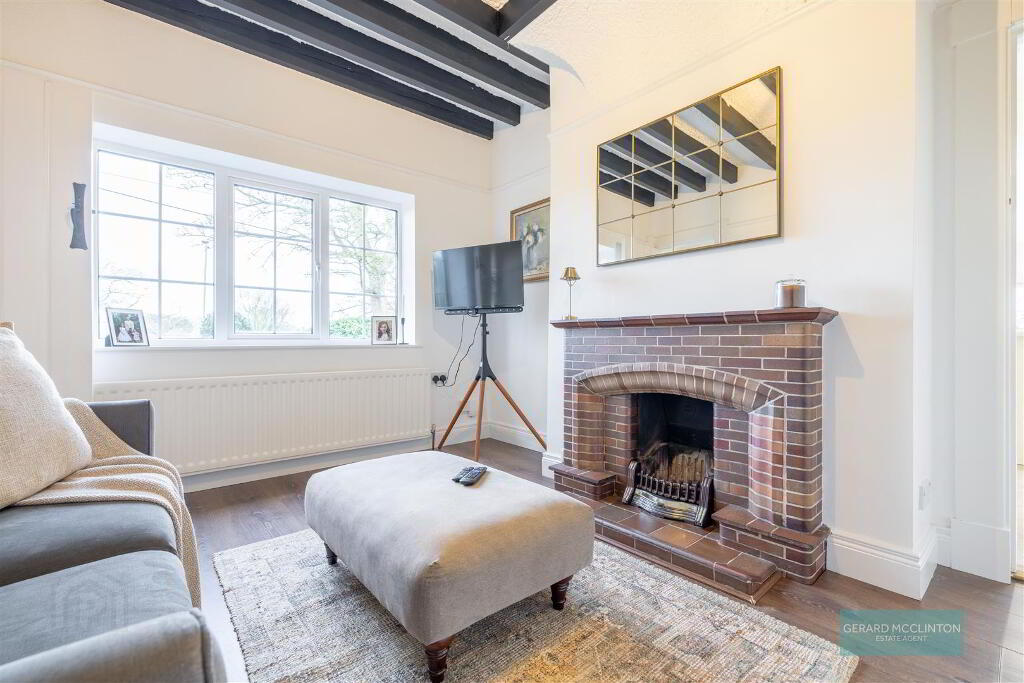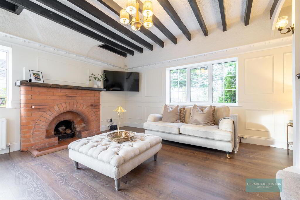 Double glazed Upvc window, feature wall panelling, picture rail, plate rail, deep skirting and frames, feature exposed roof beams and open fireplace with brick surround and chunky wood mantle, beautifully crafted staircase to first floor