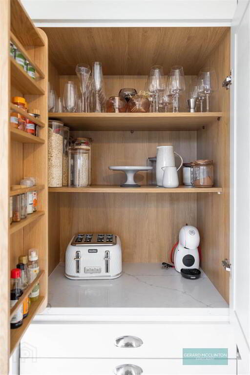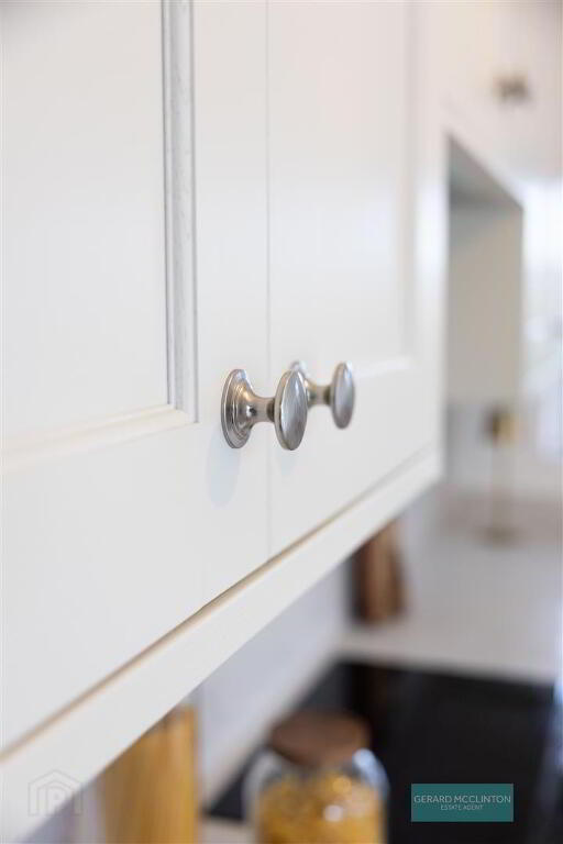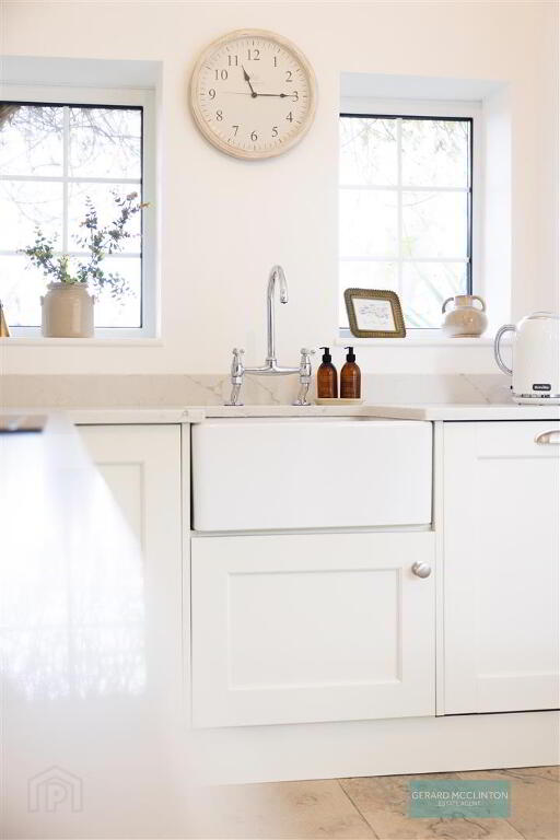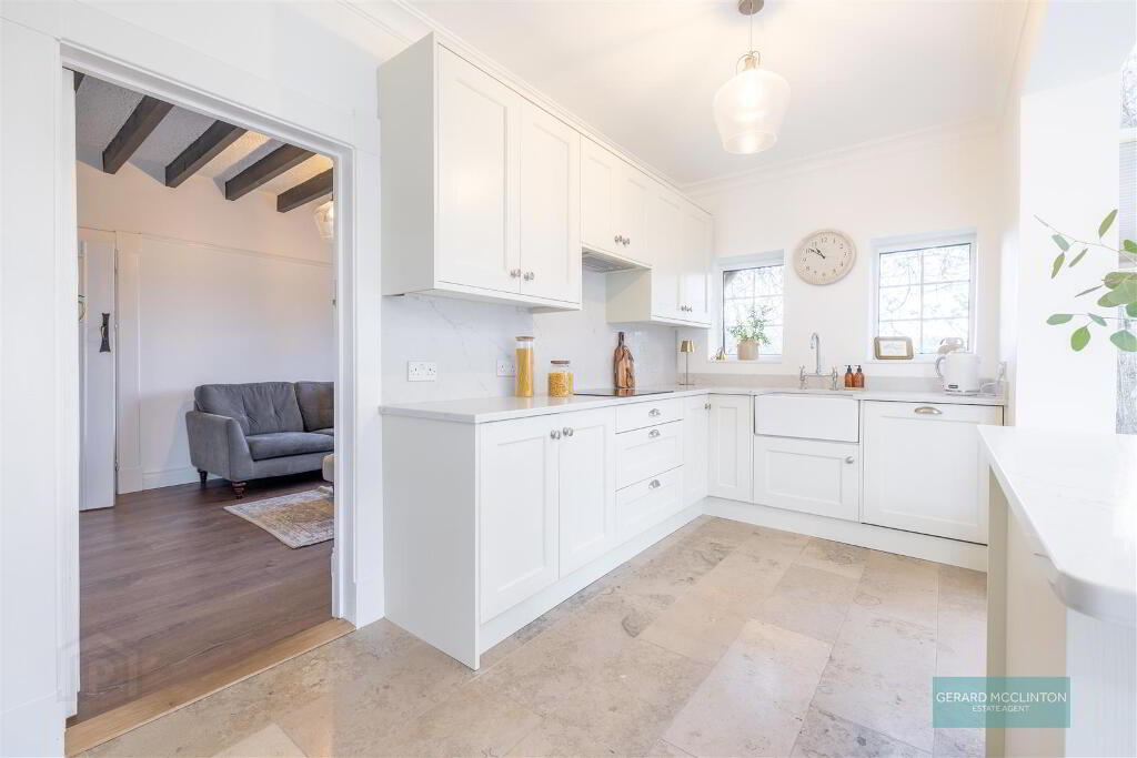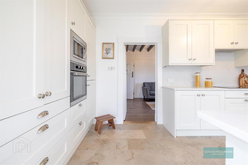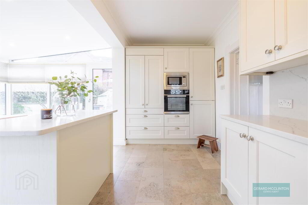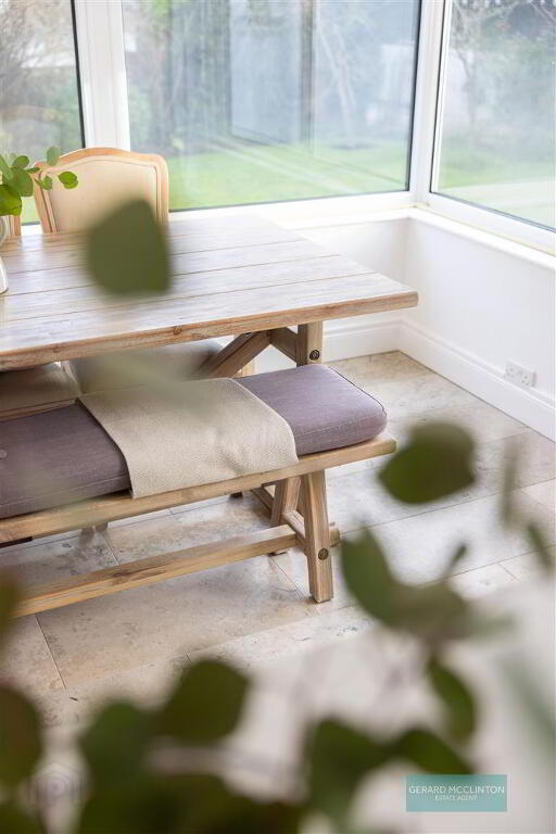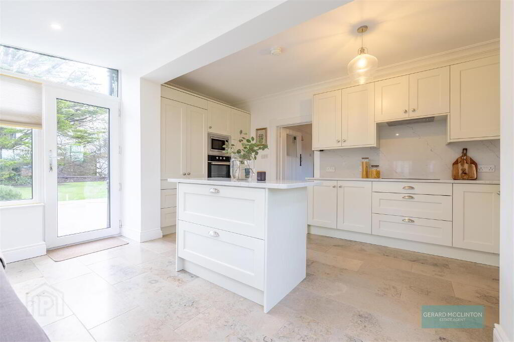 Renewed in 2023, a practical and visually impressive room with tiled flooring, extensive Upvc double glazed windows, double glazed door to rear patio, solid wooden cabinitery in elegant Porcelain colour, granite worktops, large larder style unit and deep drawers, range of integrated appliances including dishwasher, 4 ring electric hob with extractor hood over, integrated "Nordmede" high level oven with separate "Nordmende" combi microwave oven, integrated fridge freezer. A central island with deep drawers and granite worktop, "Belfast" sink with mixer tap