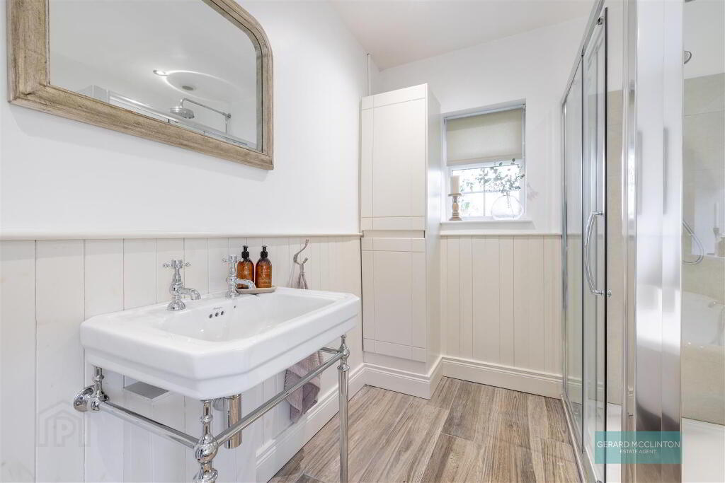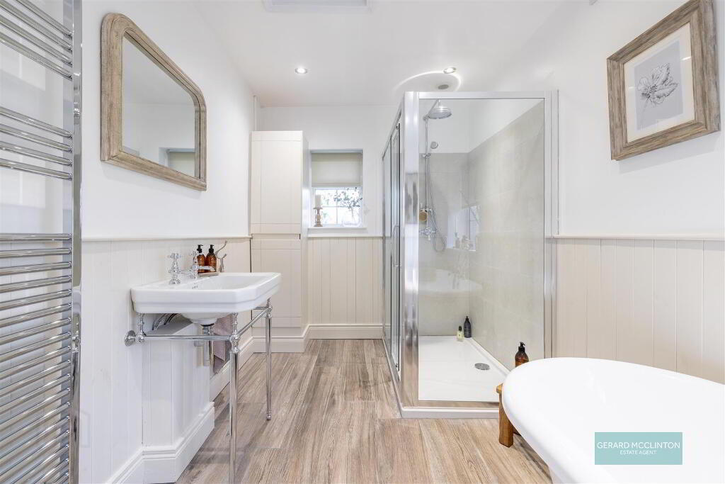 Renewed 2023, Tiled flooring, part tiled walls, Double glazed windows, heated towel rail, freestanding bath with mixer tap, separate double shower cubicle with thermostatic shower and rain style shower, console style wash hand basin, storage cupboard housing gas central heating boiler installed in 2023