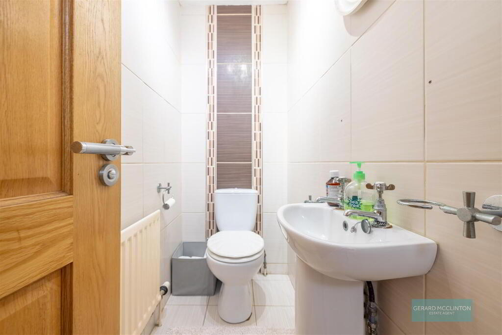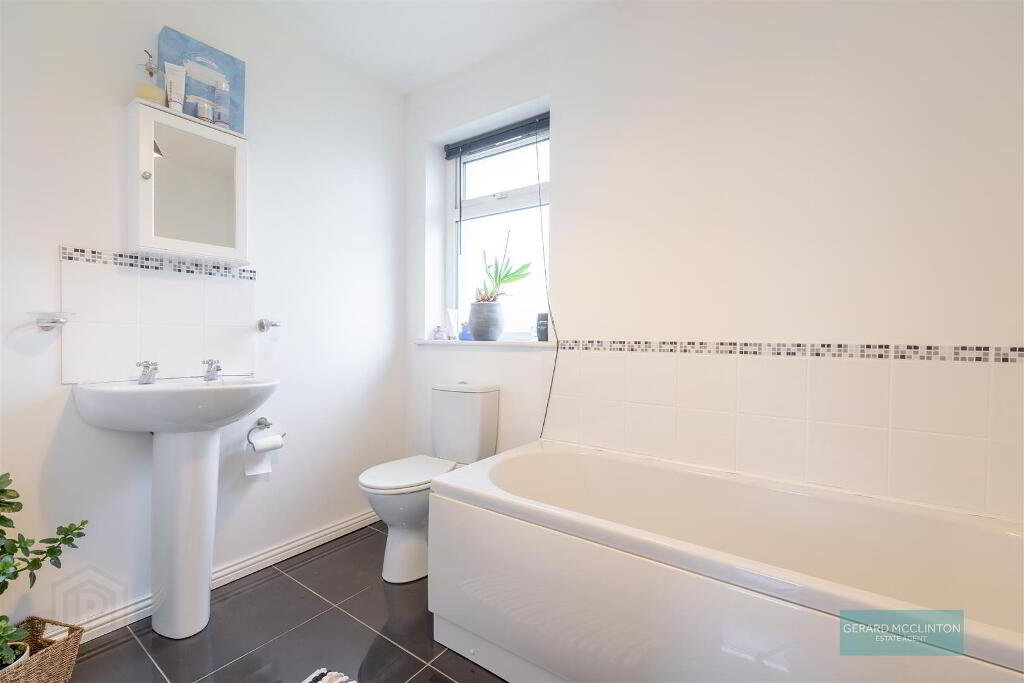 Comprising panel bath, dual flush W.C and pedestal wash hand basin. Part tiled walls and tiled floor. Extractor fan.