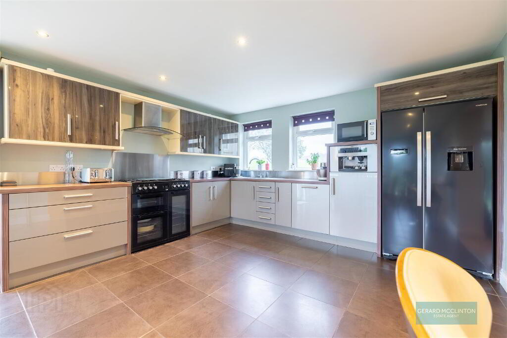 Laminate flooring to living area and tiled to kitchen/dining. Excellent range of high gloss wall and base units with timber effect worktop surfaces. Integrated dishwasher and Zanussi coffee machine. Recess for American fridge/freezer. Recess spot lighting. PVC double glazed doors to rear garden/patio.