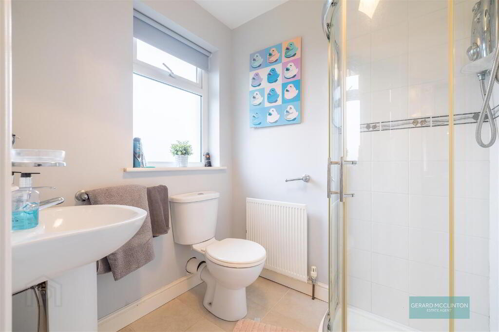 Comprising quadrant shower enclosure with electric shower. Dual flush W.C and pedestal wash hand basin with mixer taps. Tiled floor. Extractor fan.