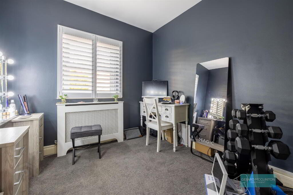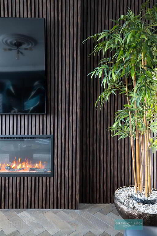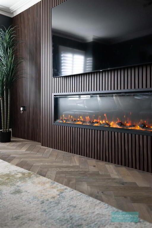 2 x Double glazed upvc windows to front with superb views over Belfast, herringbone wood flooring, ceiling coving, fluted feature wall with contemporary flame effect fire